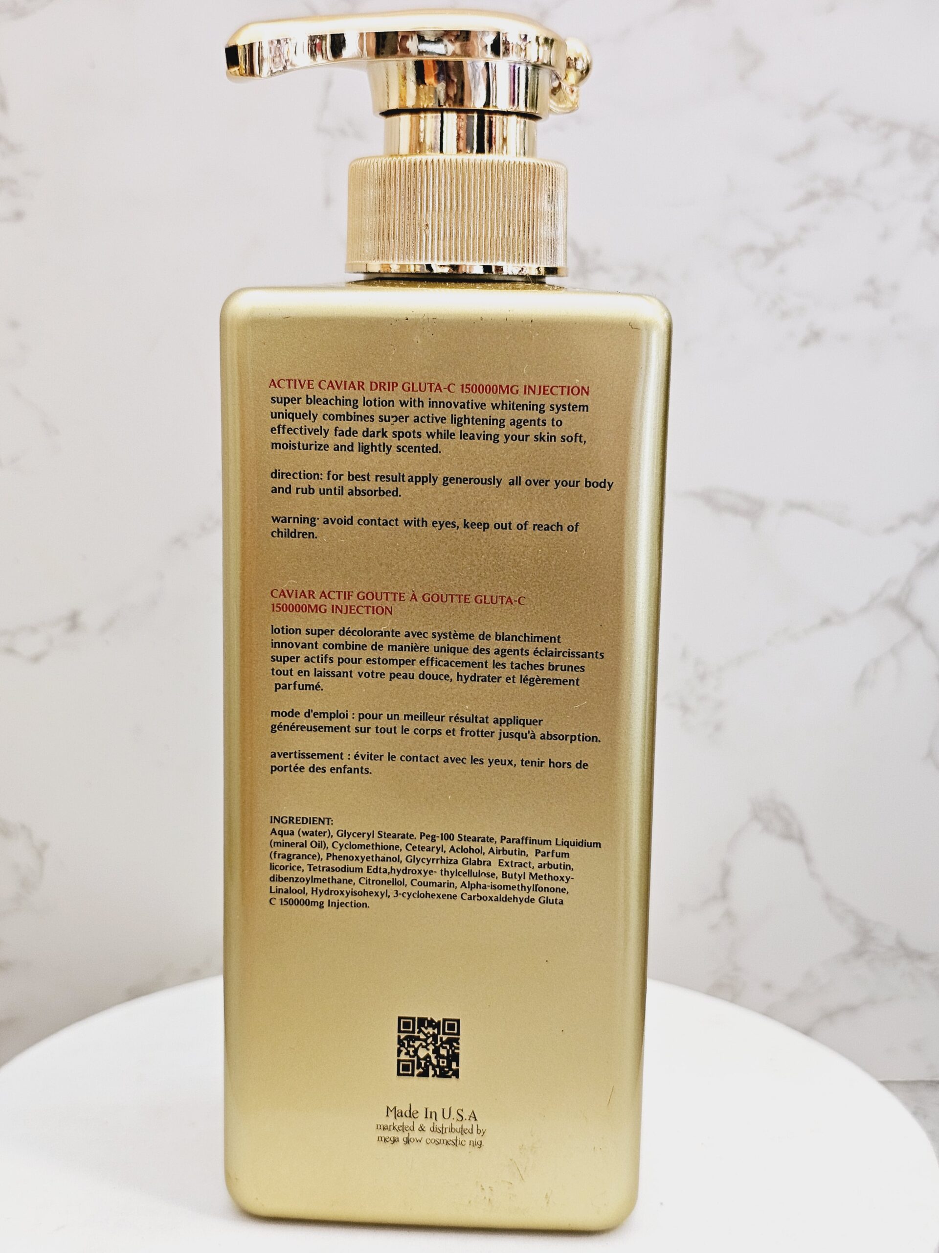 Active caviar drip gluta- c injection super bleaching lotion with innovative whitening system uniquely combines super active lightening agents to effectively fade dark spots while leaving your skin soft, moisturize and lightly scented. This light, non-greasy compound works quickly to lighten freckles, age spots, hyperpigmentation, dark patches, dark knuckles, acne scars, sunburn, wrinkles, and other skin flaws.?Super Bleaching Body Milk, Gluta Terminal White Plus.
