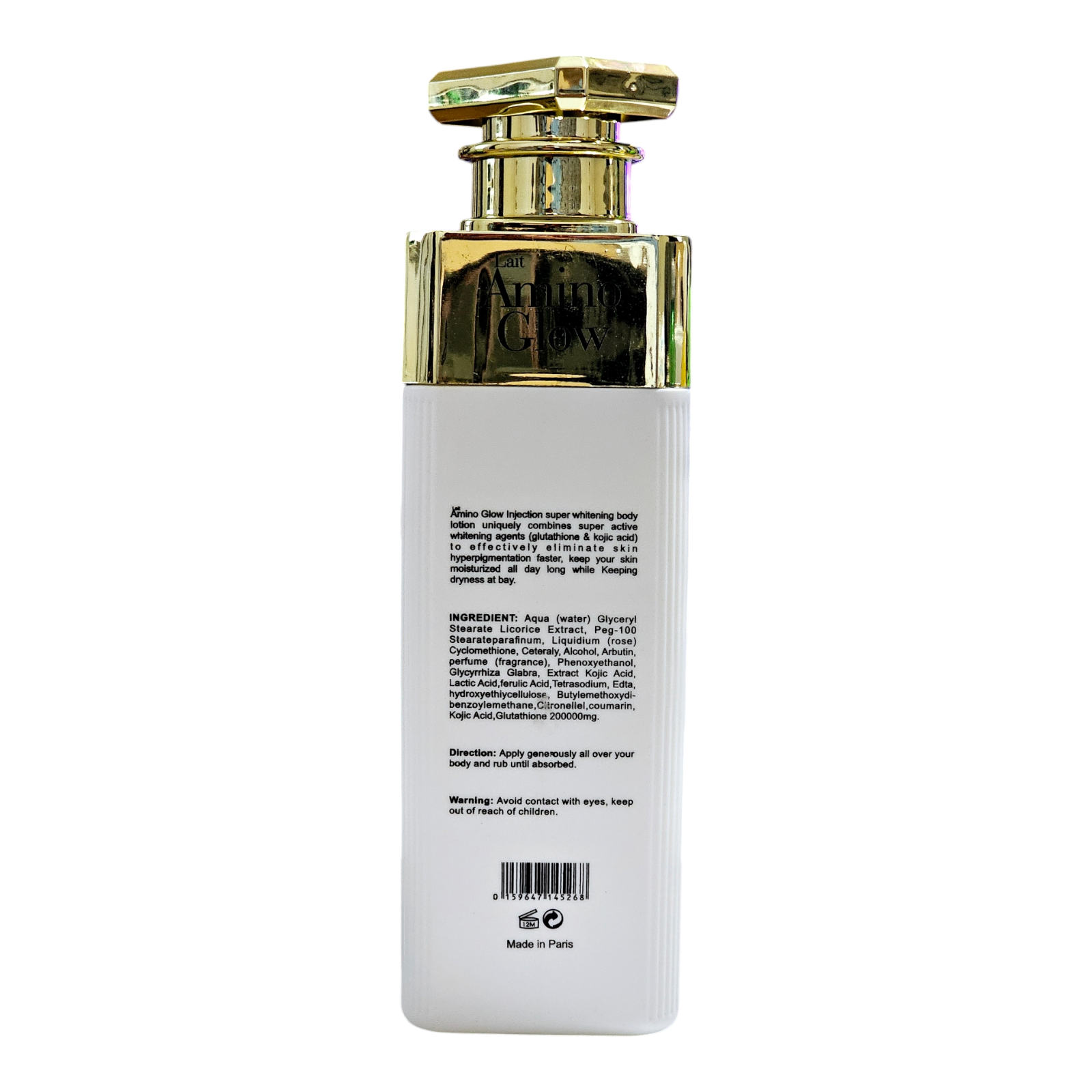 Amino Glow injection super whitening body lotion uniquely combines super active whitening agents (glutathione and kojic acid) to effectively eliminate skin hyperpigmentation faster, keep your skin moisturised all day long while keeping dryness at bay.