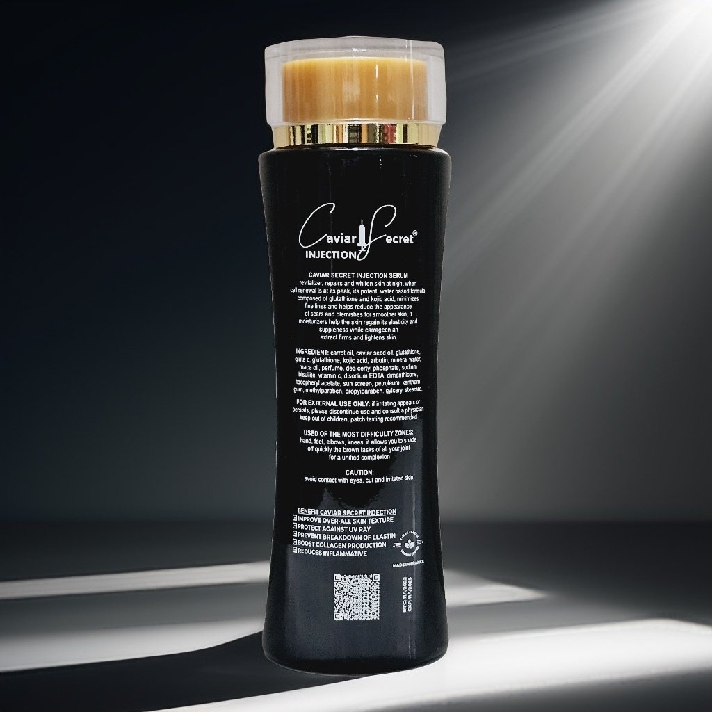 Caviar Secret Injection serum revitaliser, repairs and whiten skin at night when cell renewal is at its peak, its potent, water based formula composed of glutathione and Kojic acid. Minimises fine lines and helps reduce the appearance of scars and blemishes for smoother skin, it moisturisers help the skin regain its elasticity and suppleness while carrageen an extract firms and lightens skin.