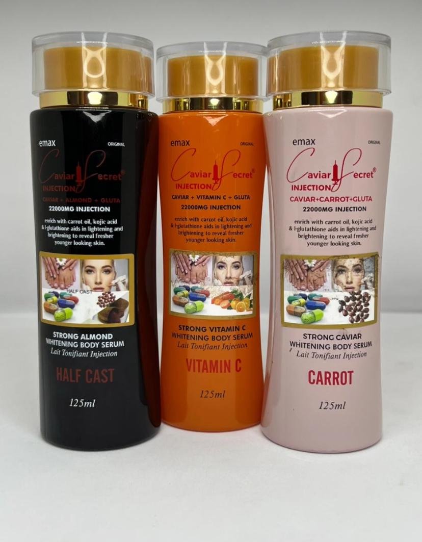 Caviar + almond + gluta. 22000mg injection, enriched with carrot oil, Kojic acid & l-glutathione aids in lightening and brightening to reveal fresher younger looking skin. Halfcast strong almond whitening body serum.