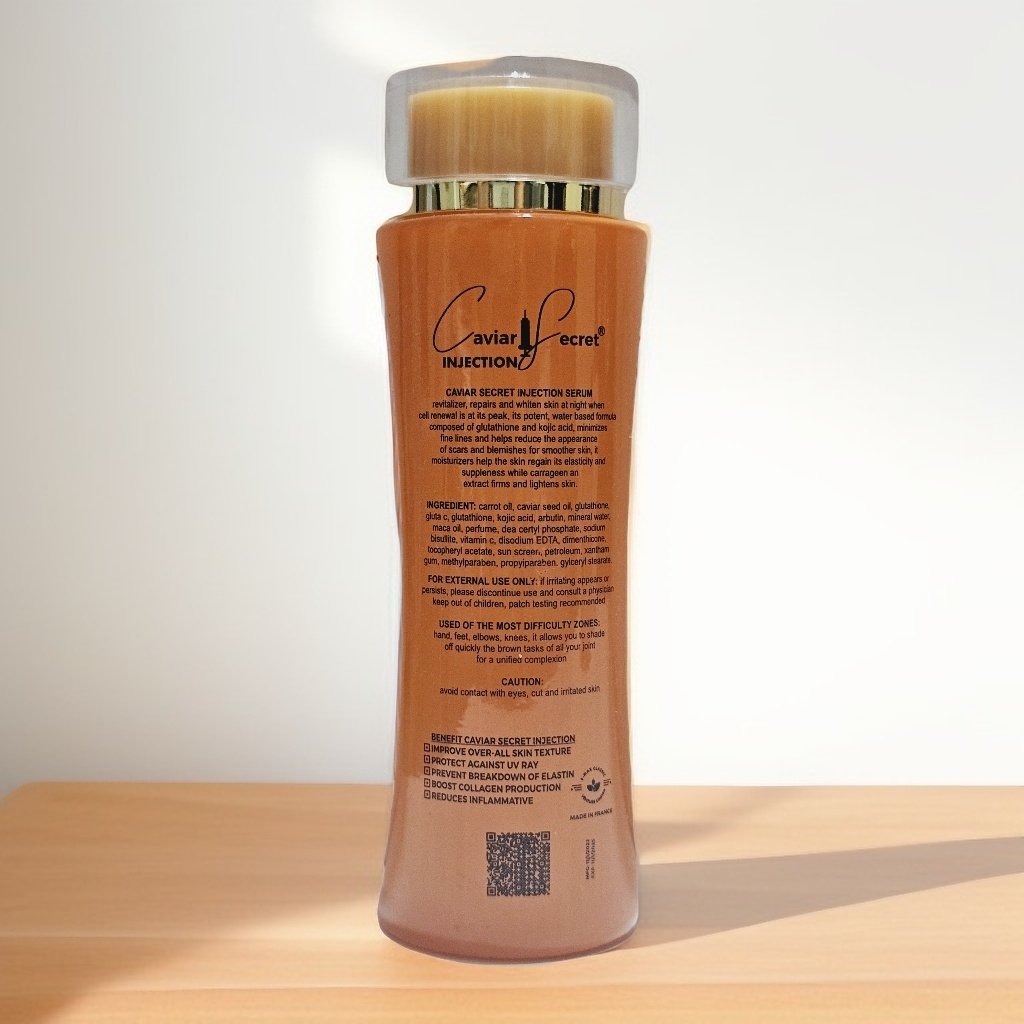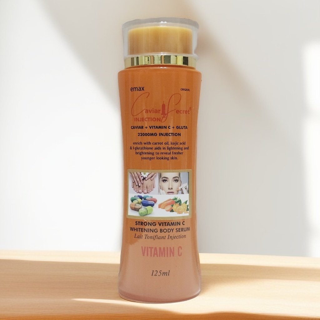 Caviar + vitamin c + gluta. 22000mg injection, enriched with carrot oil, Kojic acid & l-glutathione aids in lightening and brightening to reveal fresher younger looking skin. Strong vitamin c whitening body serum.