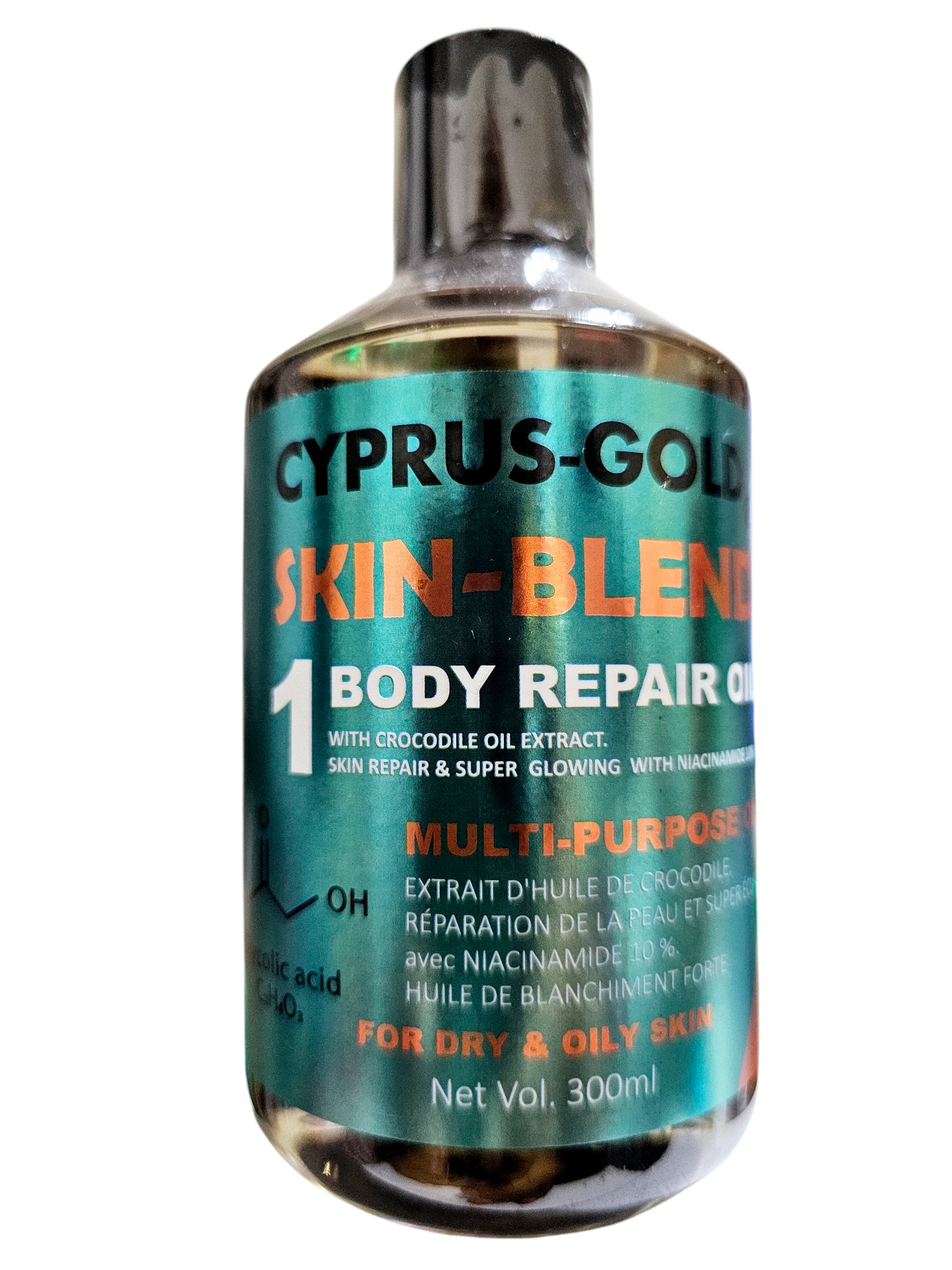 Cyprus-Gold Skin Blend. This crocodile oil has been formulated to improve skin dullnes and rejuvenates the texture. It is also readily absorbed by skin to hydrate and protect it. When applied to the skin, the collagen content in crocodile oil helps to repair skin damage white reducing wrinkles, scars, and other blemishes, pigmentation, black spots and acne