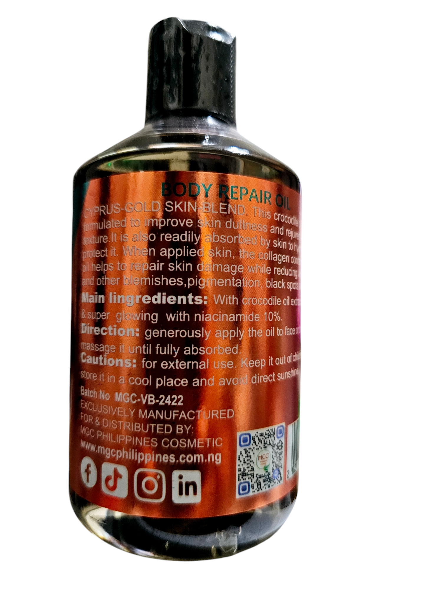 Number 1 body repair oil with crocodile oil extract. Skin repair and super glowing with niacinamide 10%. Multi-purpose oil. Contains Glycolic Acid.