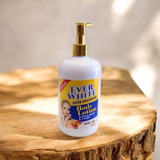 Ever White Super Whitening Body Lotion SPF 50 is a broad-spectrum brightening moisturizer combining Alpha Arbutin, Glutathione, and Glycerin to hydrate, lighten dark spots, and protect your skin from sun damage.