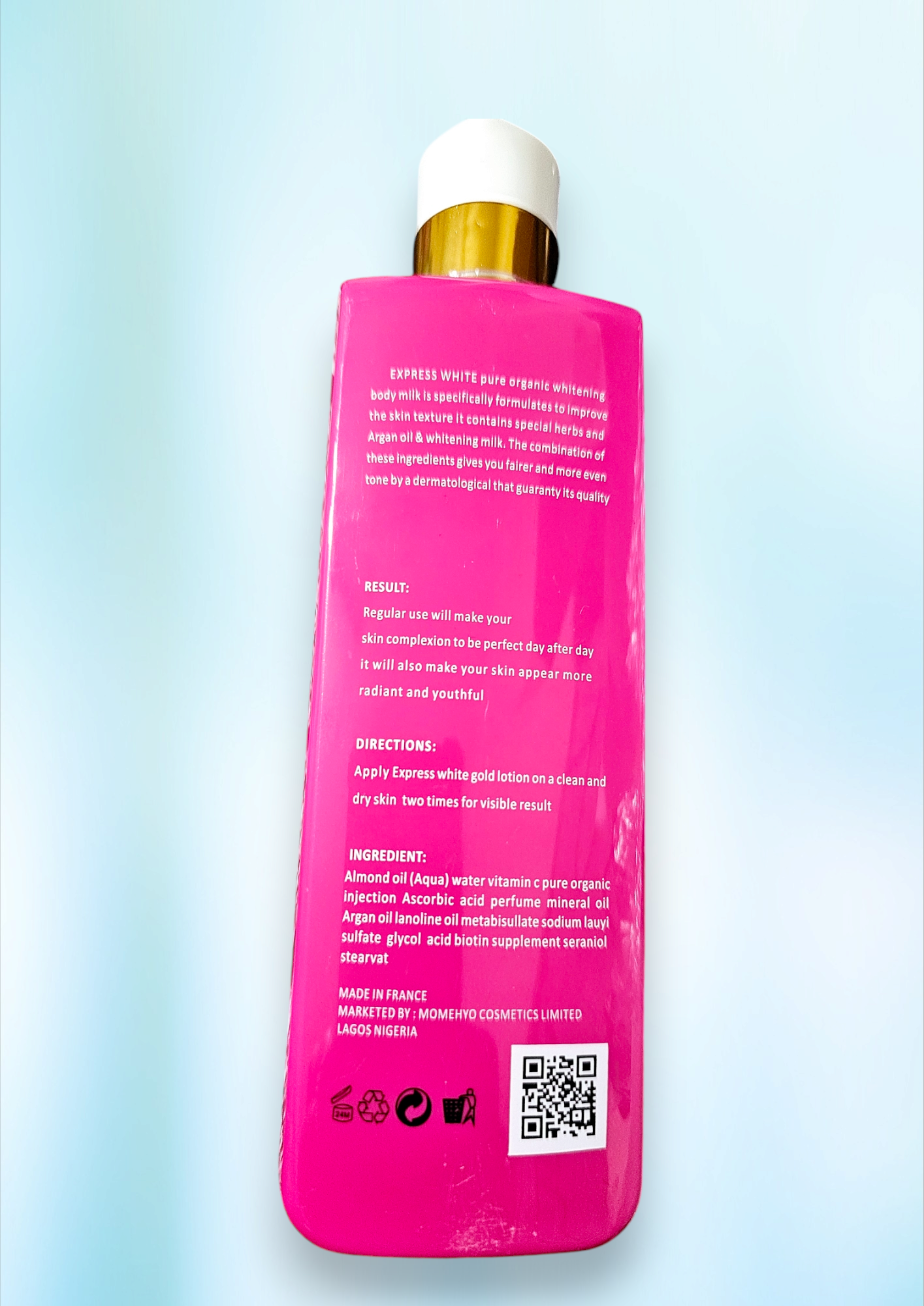 Directions – apply Express white pure organic lotion on a clean and dry skin two times daily for visible result.