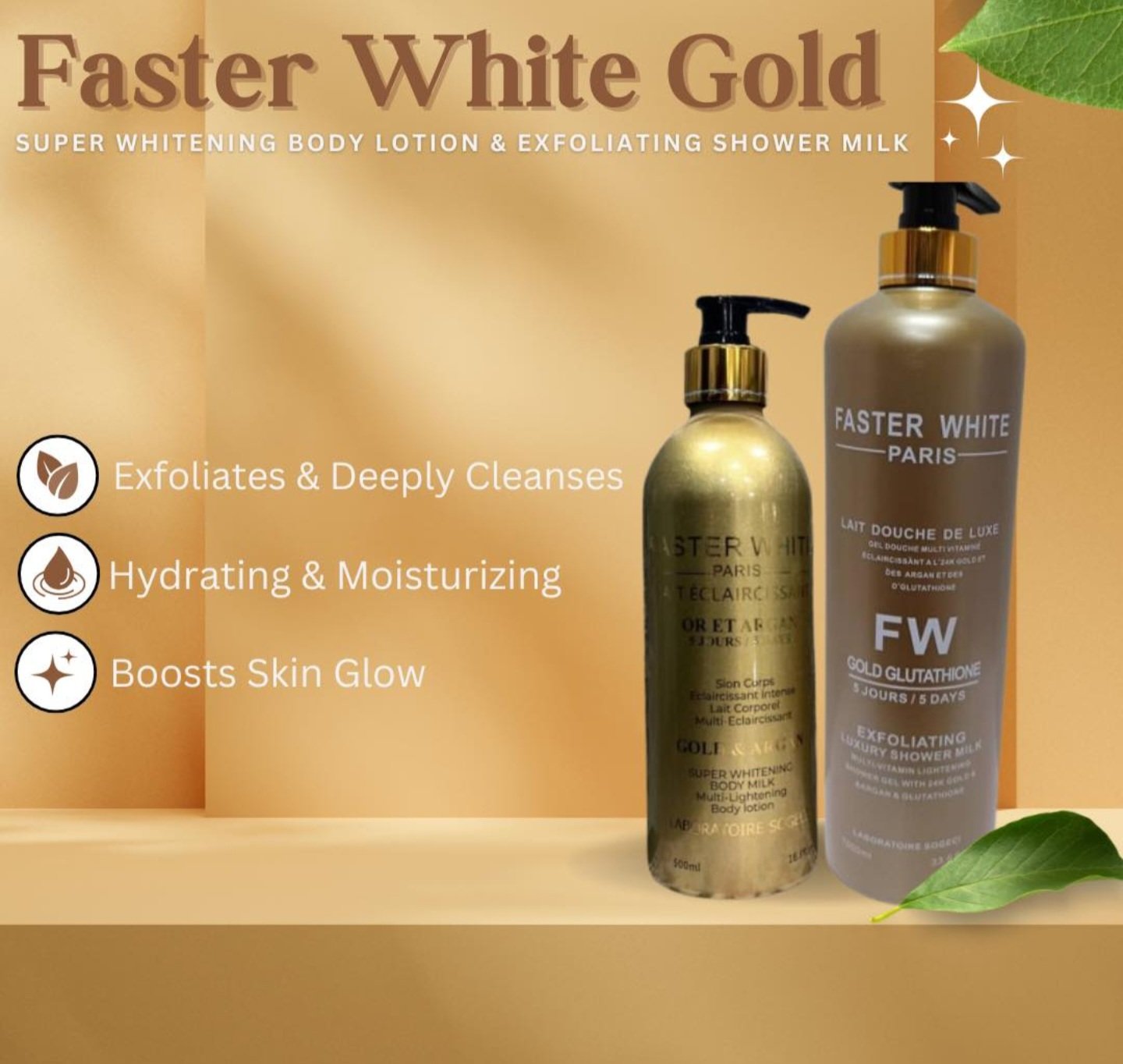 Give your skin the GOLDEN touch it deserves! Our Faster White Gold & Argan Lotion and our Faster White Gold Glutathione Luxury Shower Milk work together to hydrate, exfoliate, and brighten!