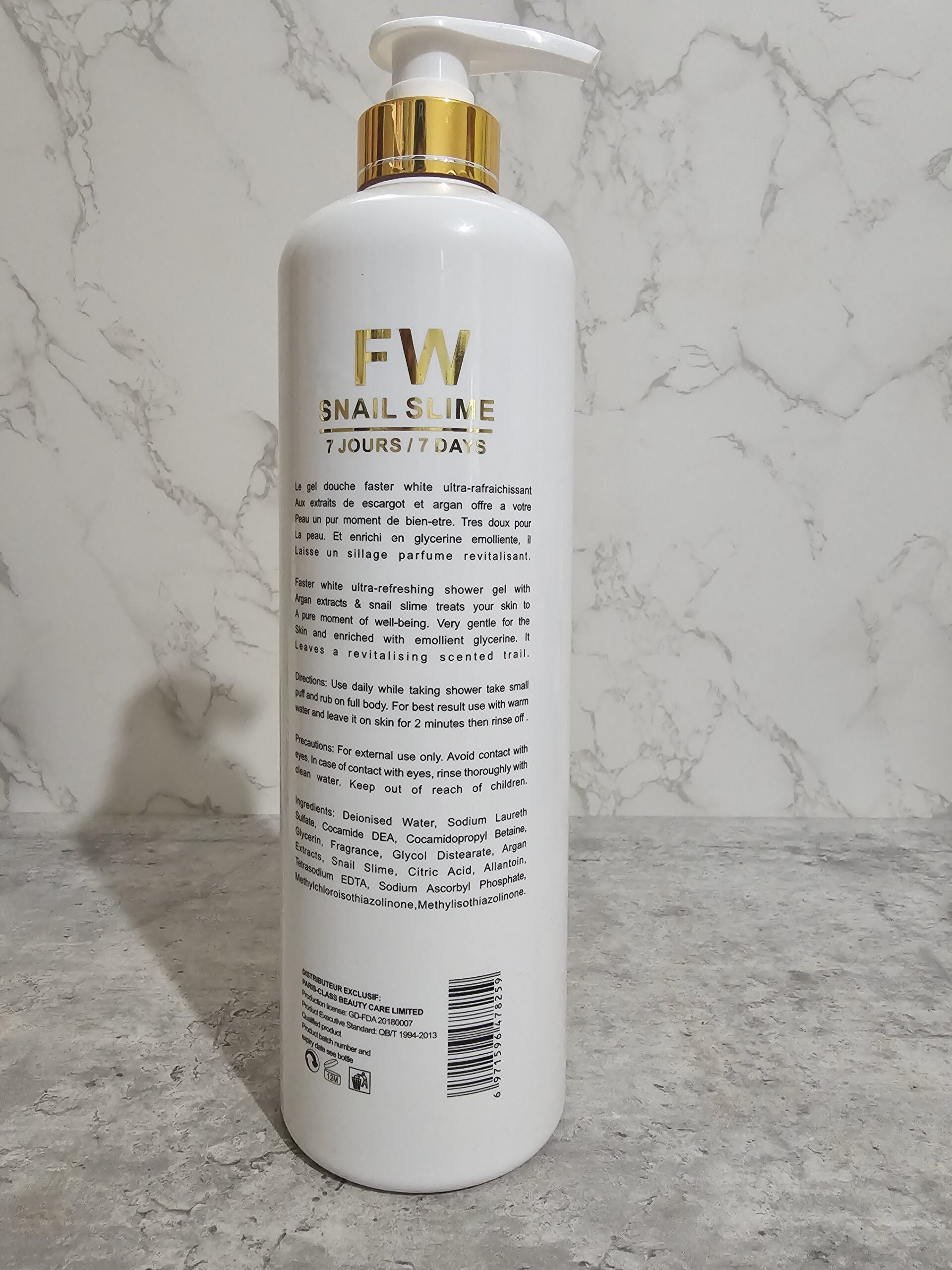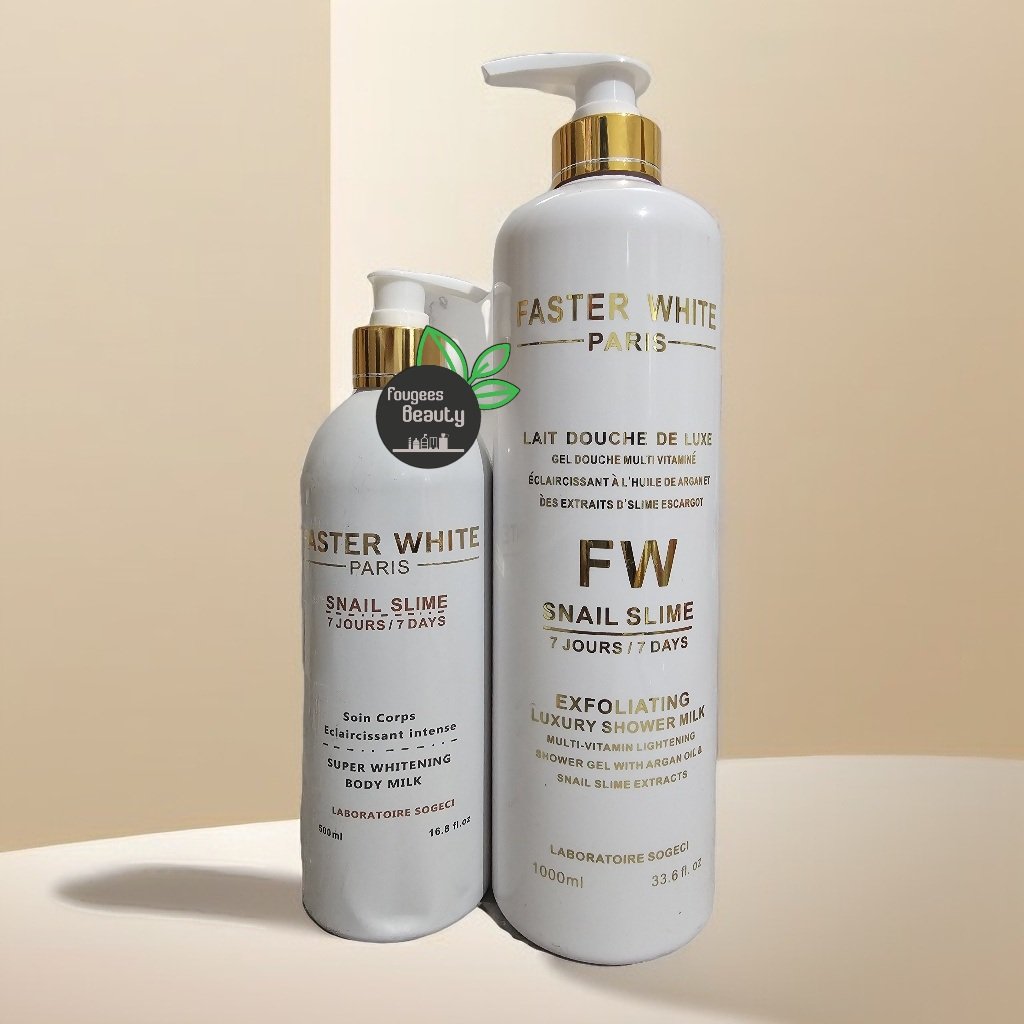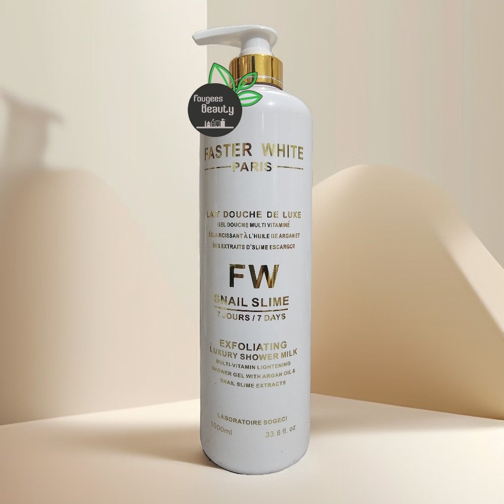 FASTER WHITE PARIS with snail slime exfoliating shower milk is for all skin type. Super effective skin whitening body luxury shower milk with visible results within 7 days (results may varies). This multi-vitamin lightening shower gel with argan oil and snail slime extracts. Gives a smooth and unified radiant complexion.
