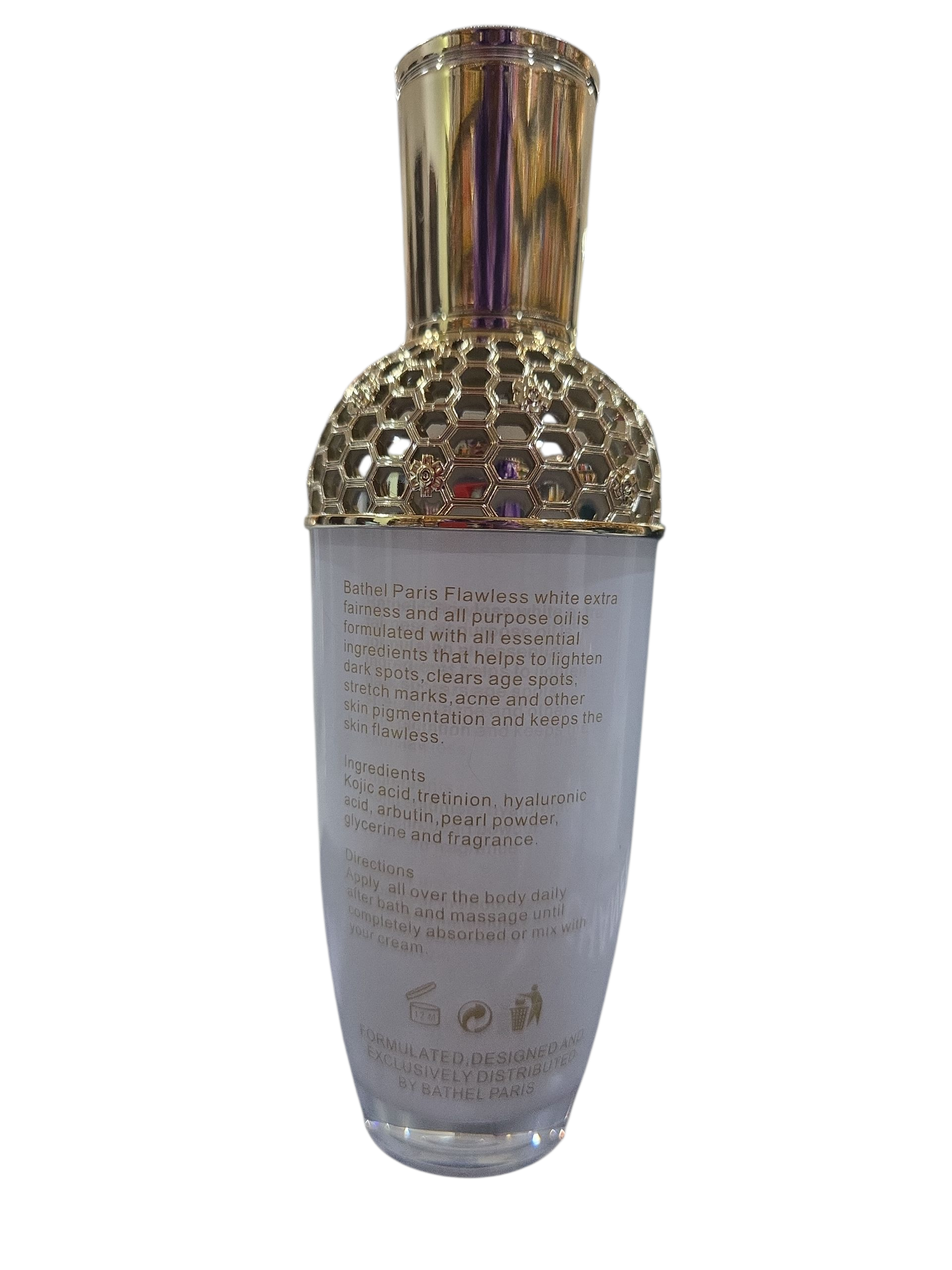 Flawless White Extra Fairness & All Purpose Oil is a luxurious skin-brightening treatment oil designed to deeply nourish, smooth, and visibly lighten the skin. Infused with potent lightening botanicals and natural oils, it helps fade dark spots, stretch marks, uneven patches, and discoloration while leaving the skin soft, radiant, and perfectly moisturized. This multi-functional oil is lightweight, non-greasy, and absorbs quickly—making it suitable for face, body, hands, and even intimate areas. Regular use helps reveal flawless, glowing skin with a visibly brighter and more even tone. Ideal for all skin types and daily use.