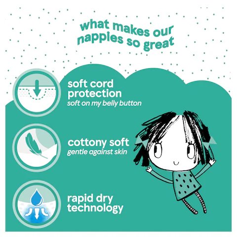 Fred & Flo Newborn Size 1 50 packSize 1 2kg 5kg 4lbs 11lbs wetness indicator, changes colour when I wee block & lock protection rapid dry technology dermatologically tested DO NOT FLUSHAt last you’re here to play with me, we’ve got so many things to see! Your bottom may be very small, but what comes out is not at all! • Block & lock protection – this special barrier will help stop anything from escaping • Breathable material – to help support healthy bottoms • Dermatologically Tested – gentle against skin • Wetness indicator – changes colour when I wee • Ahh Cottony soft – makes me think of clouds and marshmallows! • Rapid dry technology – helps ensure my skin stays dry • Absorbing channel – locks away wee for a long lasting dry feeling • Soft cord protection- soft on belly button • Snug as a bug fit – Flo, you look as cosy as can be with comfy leg cuffs and elasticated waistband • A fit guide – shows when I’m ready for the next size up! Nappy for illustration purposes only. Designs may vary.