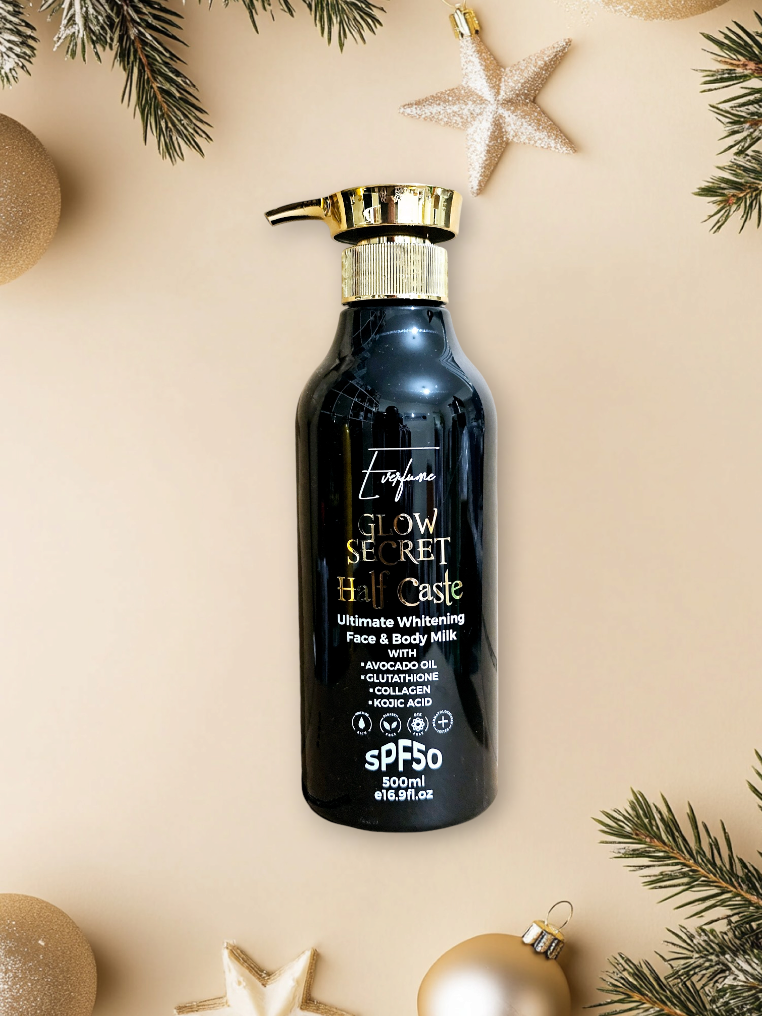 Whitening body milk 3X skin polishing SPF50. Glow Secret whitening body milk formula with a complex of plant extracts, including glutathione that offer extreme depigment power and kojic acid vectorised with an ingredient that increases its skin penetration abilities for intense whitening action.