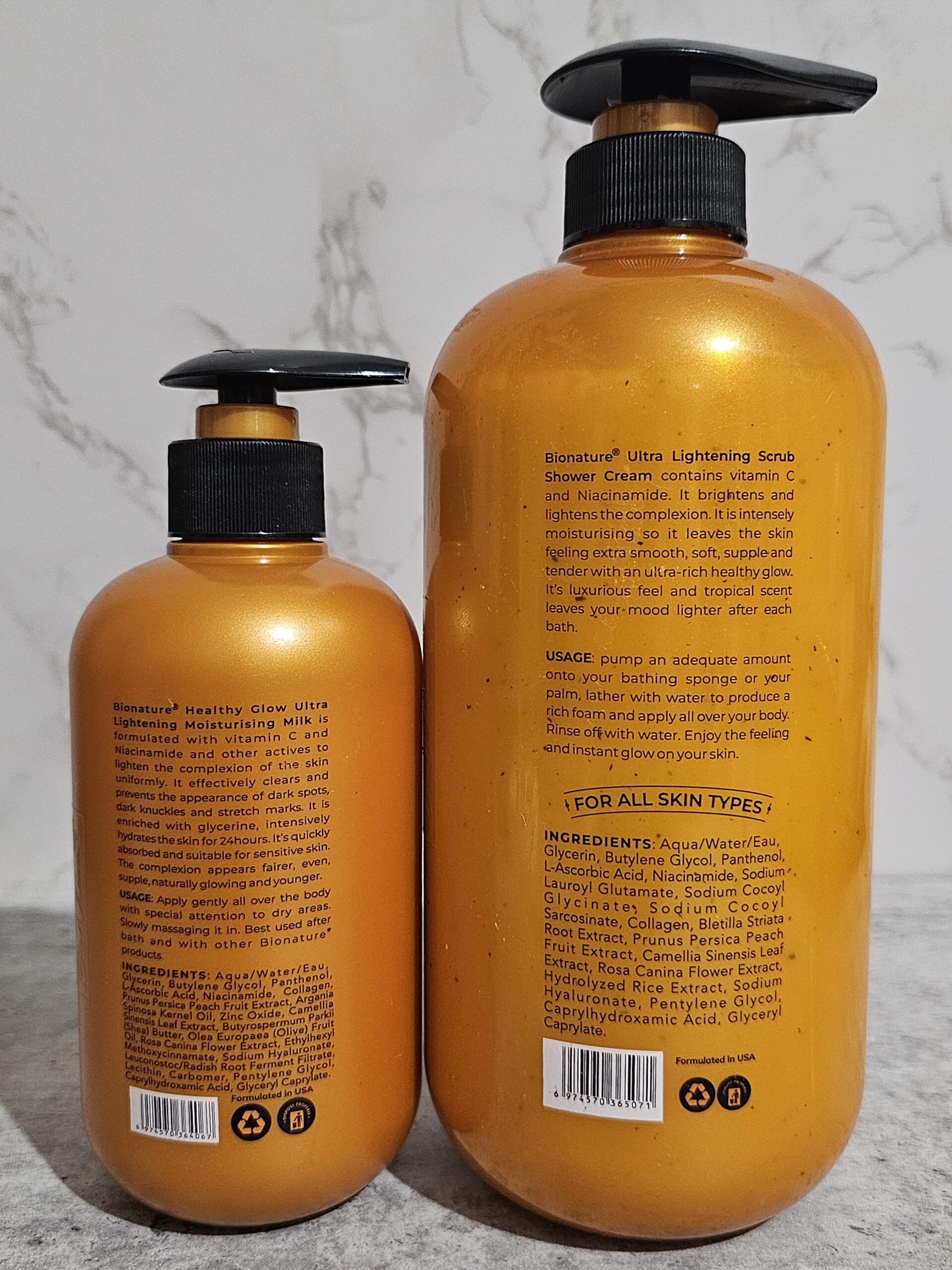 Usage – pump an adequate amount onto your bathing sponge or your palm, lather with water to produce a rich foam and apply all over your body. Rinse off with water. Enjoy the feeling and instant glow on your skin.