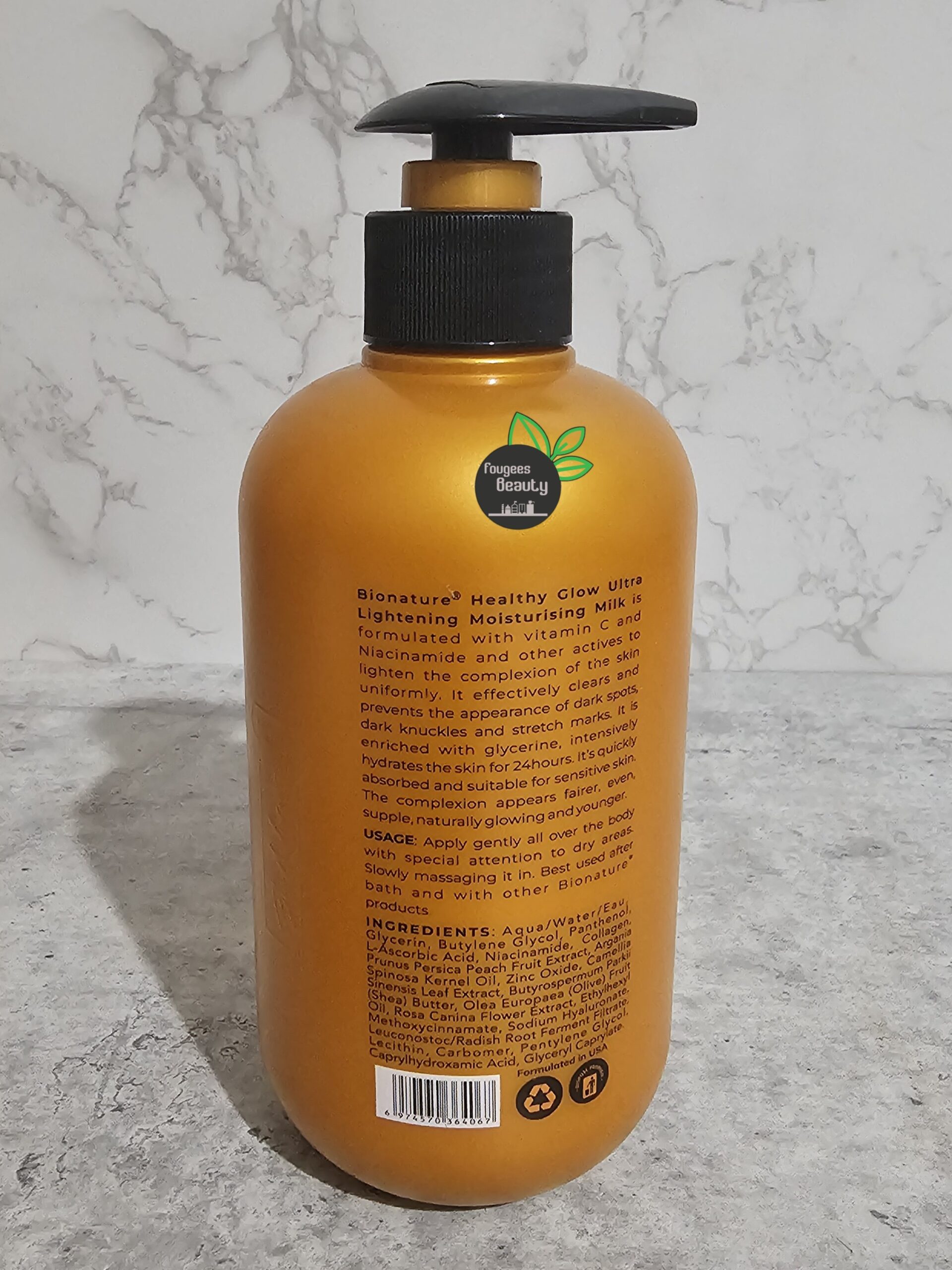 Bionature Healthy Glow Ultra Lightening Moisturizing Milk is formulated with vitamin C and Niacinamide and other actives to lighten the complexion of the skin uniformly. It effectively clears and prevents the appearance of dark spots, dark knuckles and stretch marks, it is enriched with glycerine, intensively hydrates the skin for 24 hours. Its quickly absorbed and suitable for sensitive skin. The complexion appears fairer, even, supple, naturally glowingnand younger.
