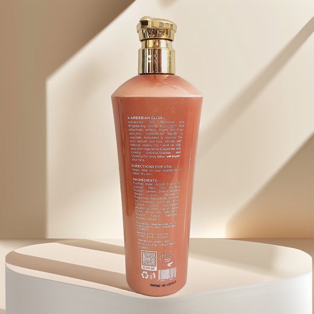 Kareebian Glow: advanced skin whitening and brightening toning body lotion that effectively whitens, brightens and firms skin. This Kareebian Glow is specially formulated to improve the skin texture and tone. Infused with Natural organic oil, carrot oil, Kojic acid and glycerin to leave the skin looking luminous, gracious and glowing.