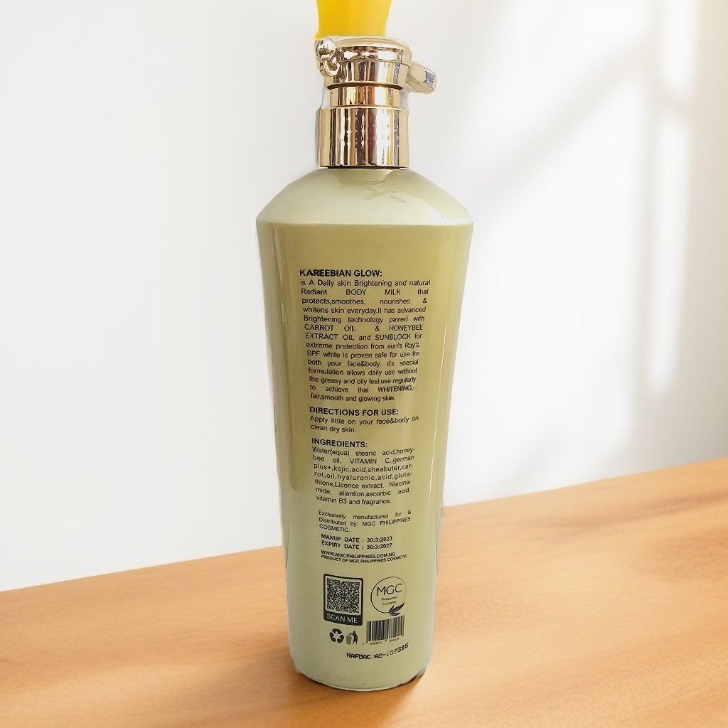 Kareebian Glow: is a daily skin brightening and natural radiant body milk that protects, smoothes, nourishes & whitens skin everyday. It has advanced brightening technology paired with carrot oil & honeybee extract oil and sunblock for extreme protection from sun rays. SPF white is proven safe for use for formulation allows daily use without the greasy and oily feel. Use regularly to achieve that whitening, fair, smooth and glowing skin.