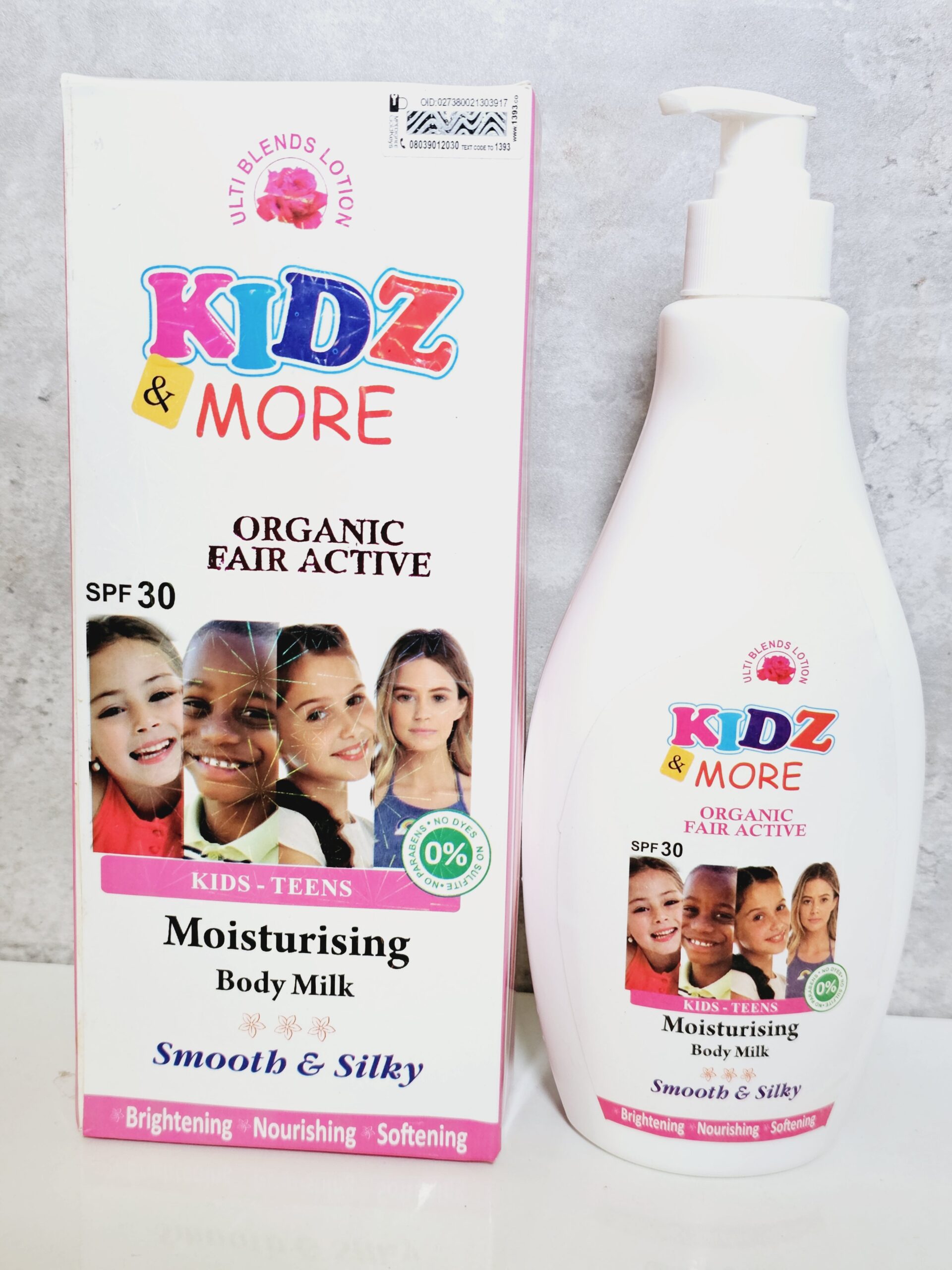 Kidz & More Organic Fair Active Moisturizing Body Milk?is a body lotion suitable for young kids and teenagers. Formulated with natural hydrating oils: Almond and Shea Butter to deeply moisturize, rejuvenate and mildly brighten your child?s skin tone. It contains SPF30 ? sun protecting formula to protect the skin from the damaging sun rays.