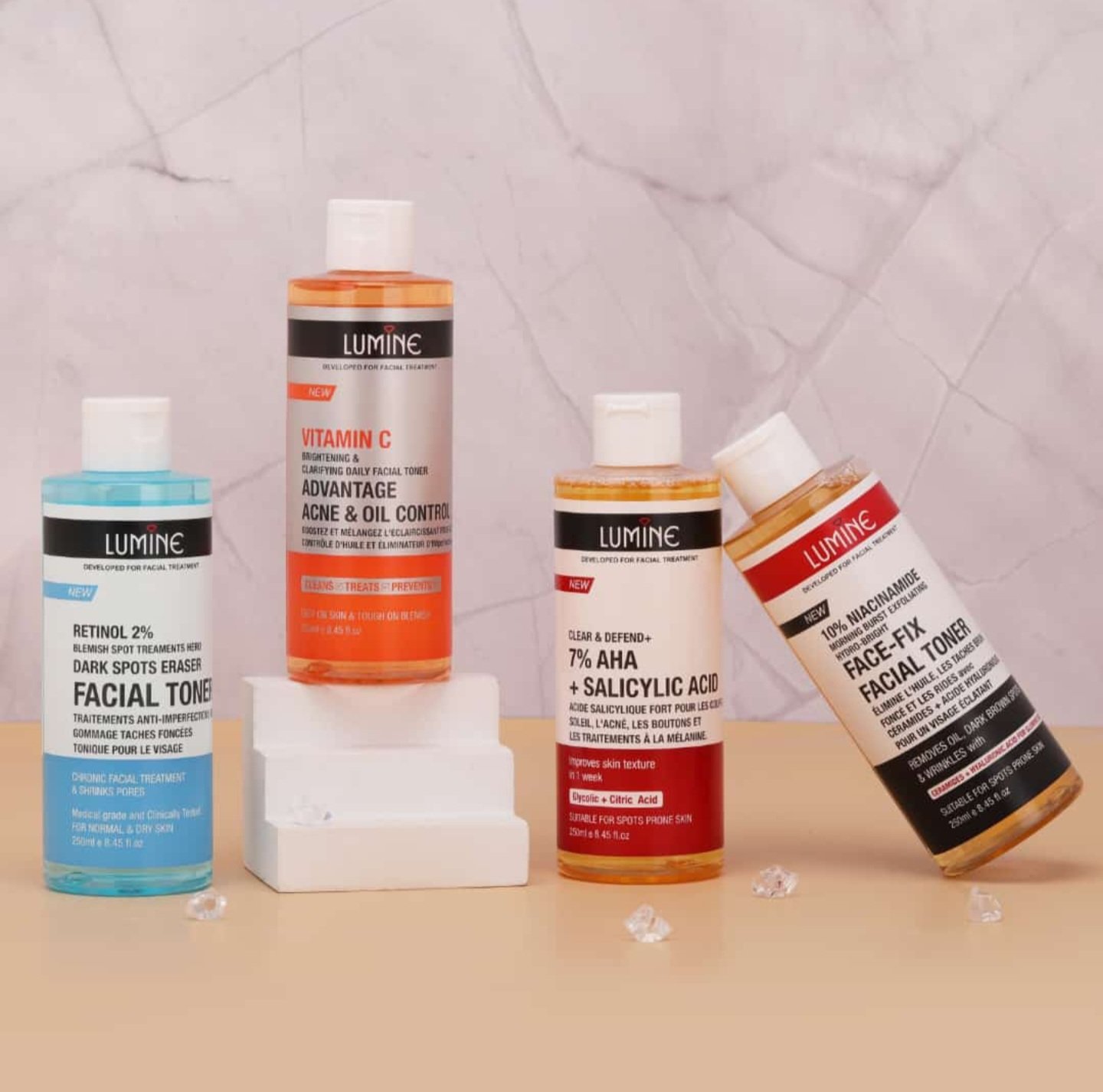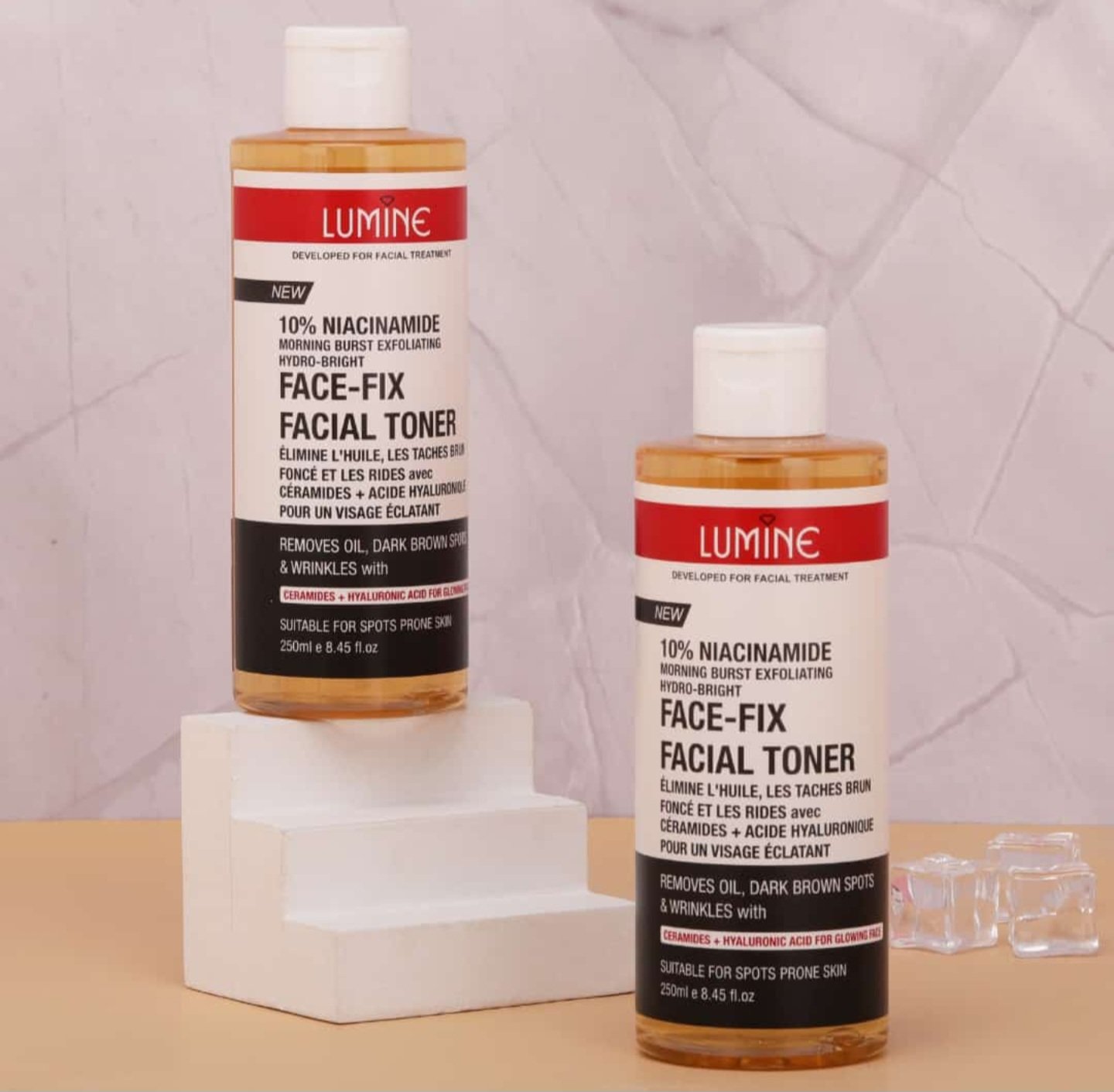 Lumine facial toner is developed for facial treatment. 10% Niacinamide, morning burst exfoliating hydro-bright face fix facial toner. Removes oil, dark brown spots and wrinkles with Ceramides, Hyaluronic acid for glowing face. Suitable for spots prone skin.