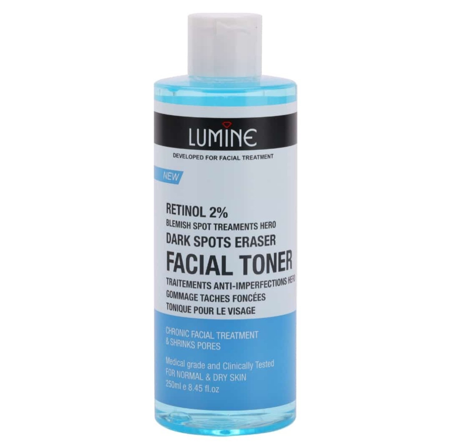 Lumine facial toner is developed for facial treatment. It contains Retinol 2%, blemish spot treatments hero, dark spots eraser. Chronic facial treatment & shrinks pores. Medical grade and clinically tested for normal & dry skin.