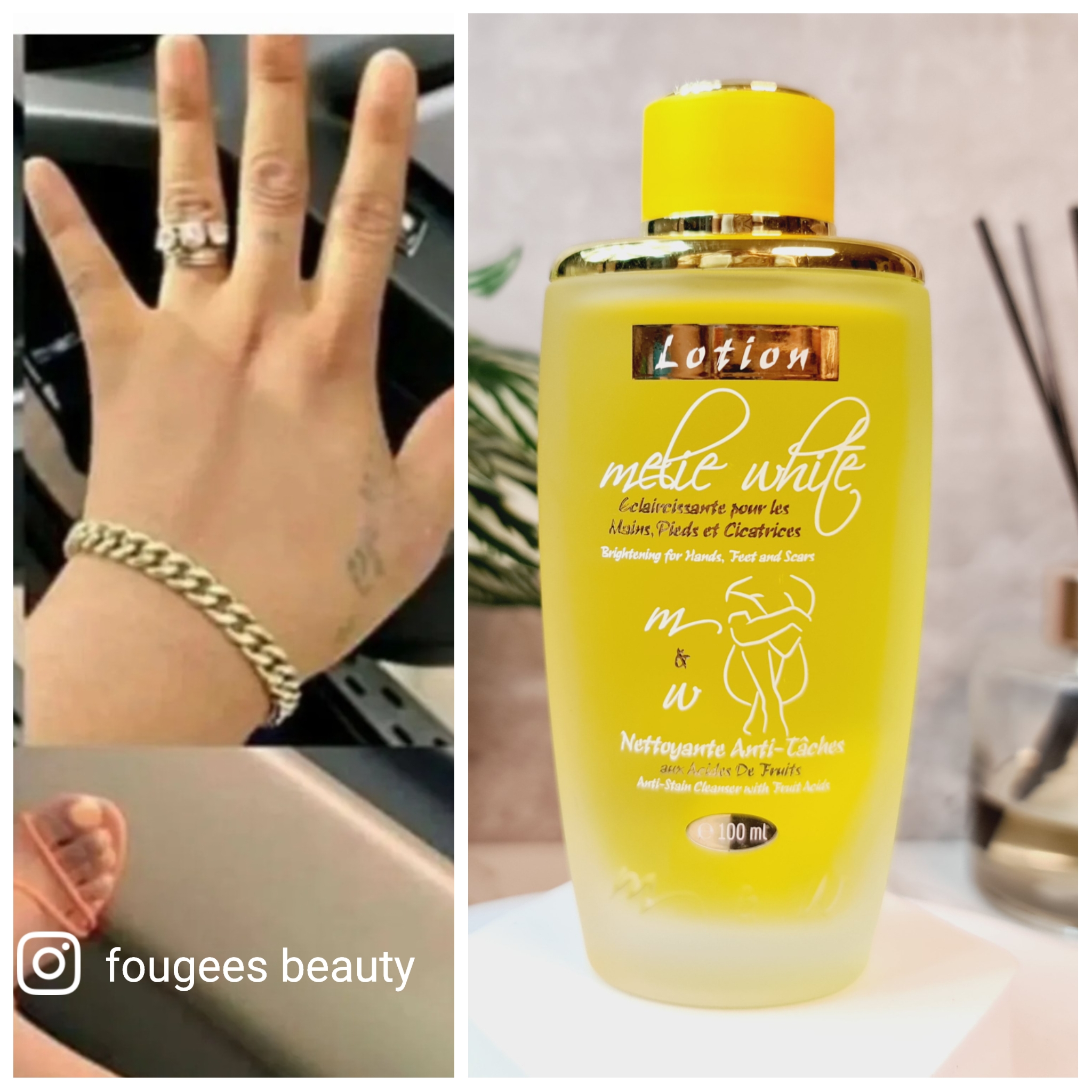 This formulation contains fruit fragrance, the gumming lotion MELIE WHITE triple action is designed to fight effectively against spots. It also remove dirty skin cells, rejuvenate and invigorate it. Melie White Lightening Lotion for Hand, Feet and Scars is intensive care. Highly efficient, it gets rid of all scars, black spots, brown sport on the hands, legs and feet. Enriched with fruit acids unifies and effectively depigments imperfections and rebellious areas of the body (knees, elbows, toes and fingers).
