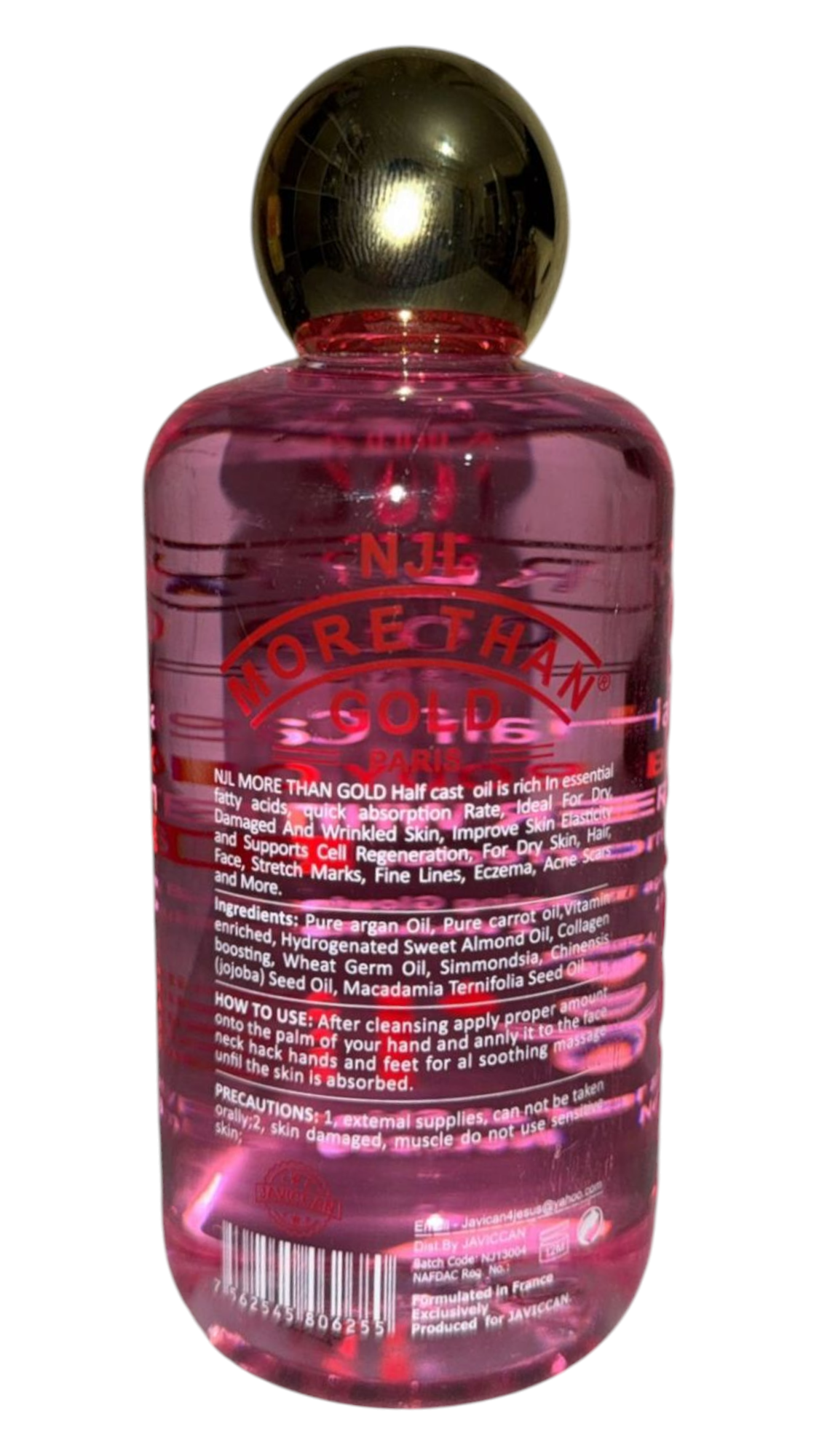 More Than Gold half cast oil is rich in essential fatty acids, quick absorption rate, ideal for dry damaged and wrinkled skin, improve skin elasticity and support cell regeneration, for dry skin, hair, face, stretch marks, fine lines, eczema, acne scars and more.