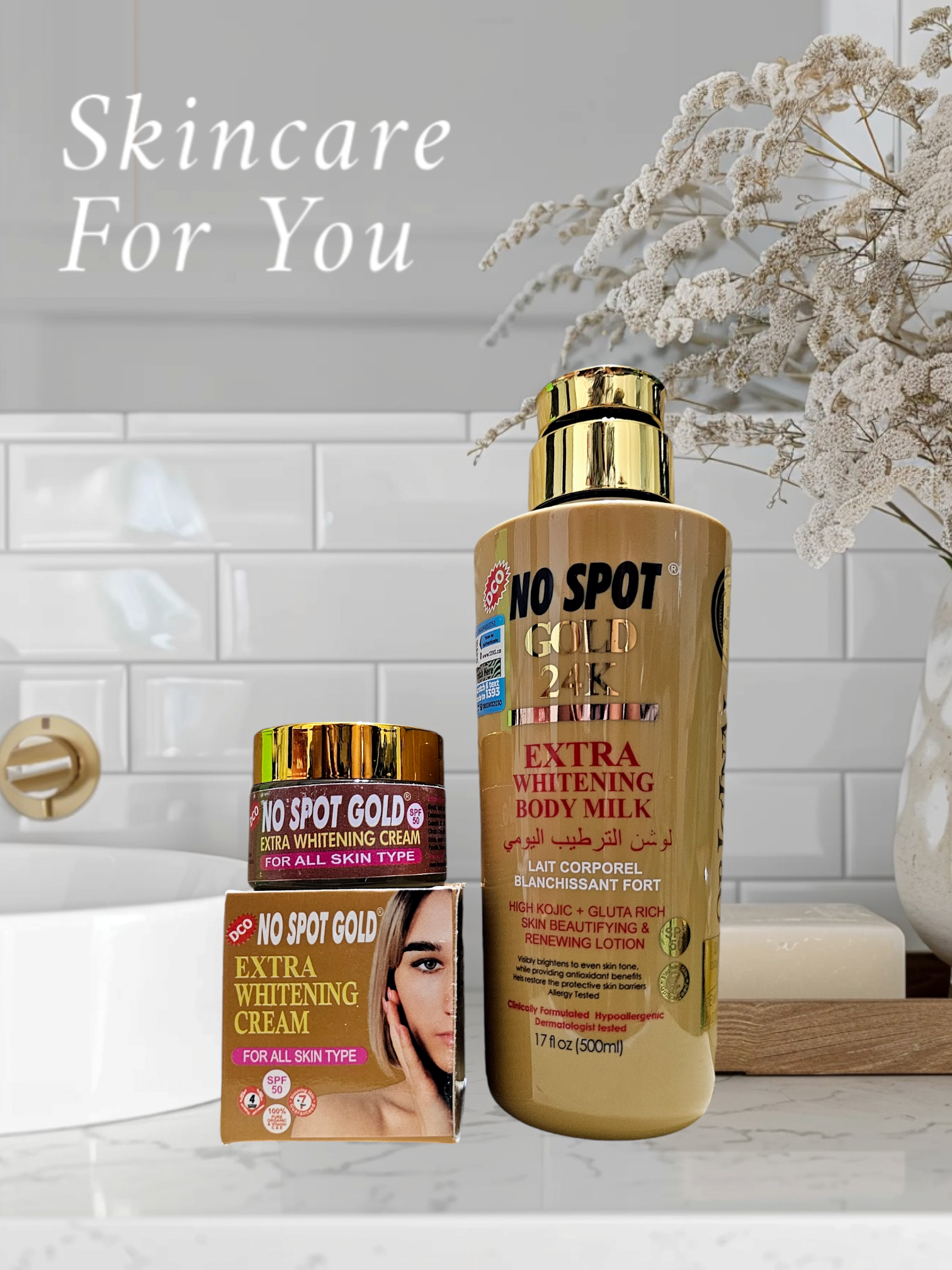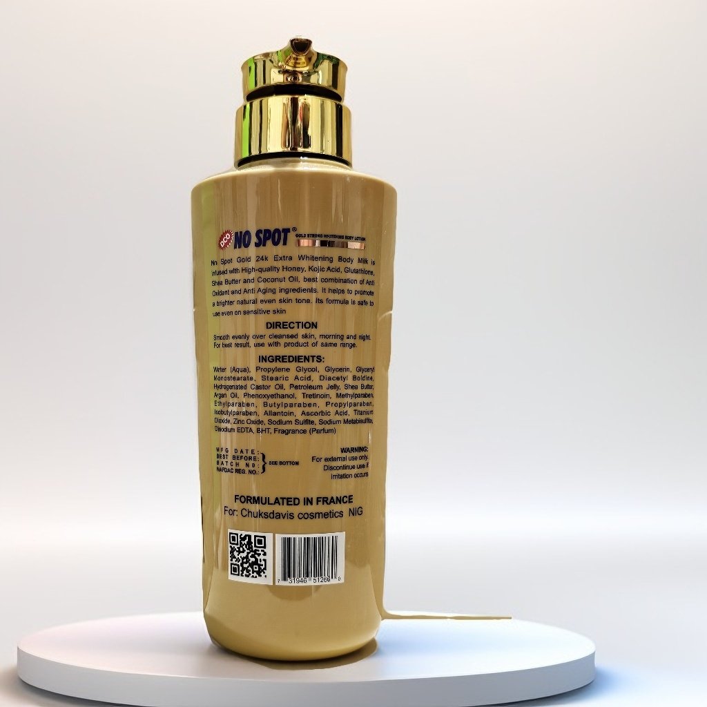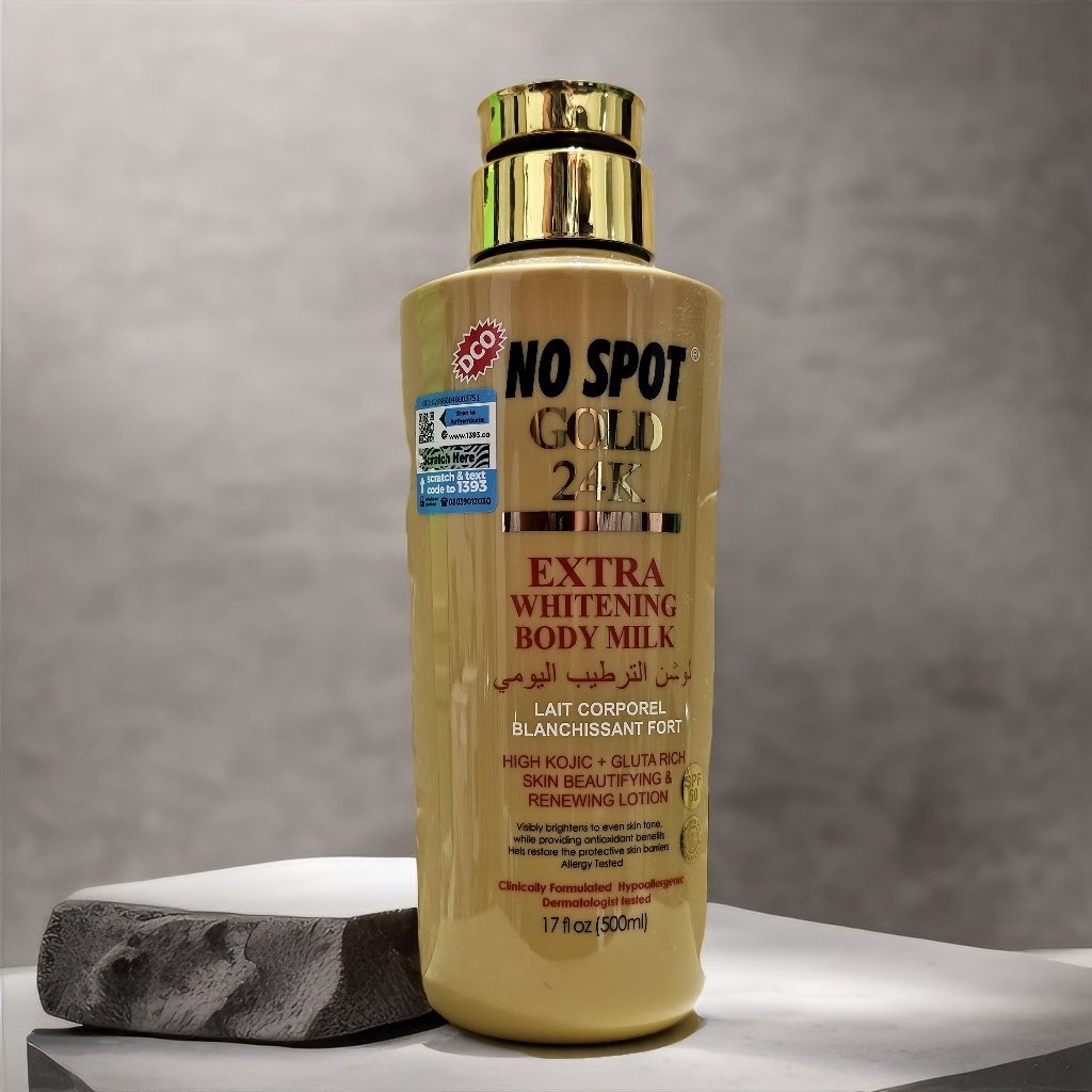 No Spot Gold 24K Extra Whitening Body Milk is infused with high quality honey, kojic acid, glutathione, shea butter and coconut oil, best combination of anti oxidant and anti aging ingredients. It helps to promote a brighter natural even skin tone. Its formula is safe to use even on sensitive skin.