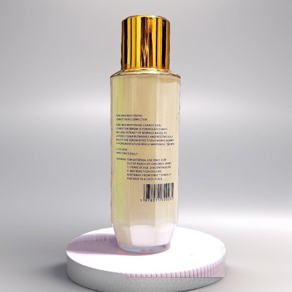 Skin corrector serum with morrocan oil 5 ways action. Pure Max whitening carrot skin corrector serum is formulated with natural extract or Moroccan oil to actively clear blemishes and restore your beauty. The serum effectively works against hyperpigmentation while whitening the skin.