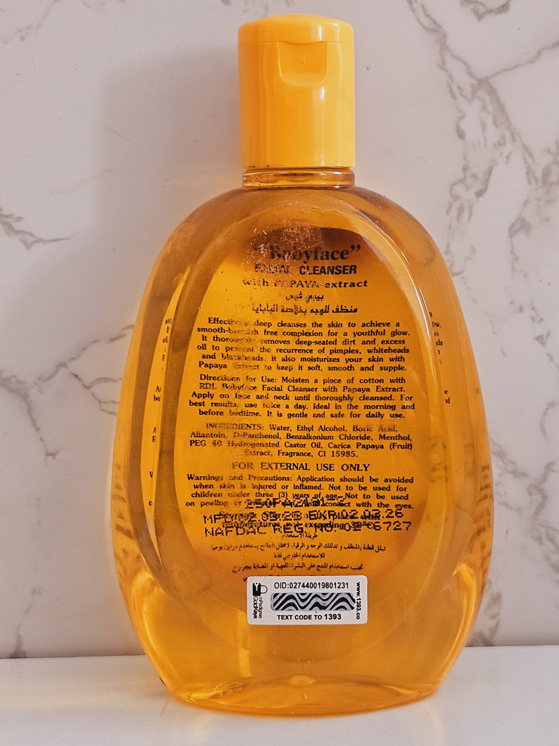 Direction for Use: Moisten a piece of cotton with RDL Babyface Facial Cleanser with Papaya Extract. Apply on face and neck until thoroughly cleansed.