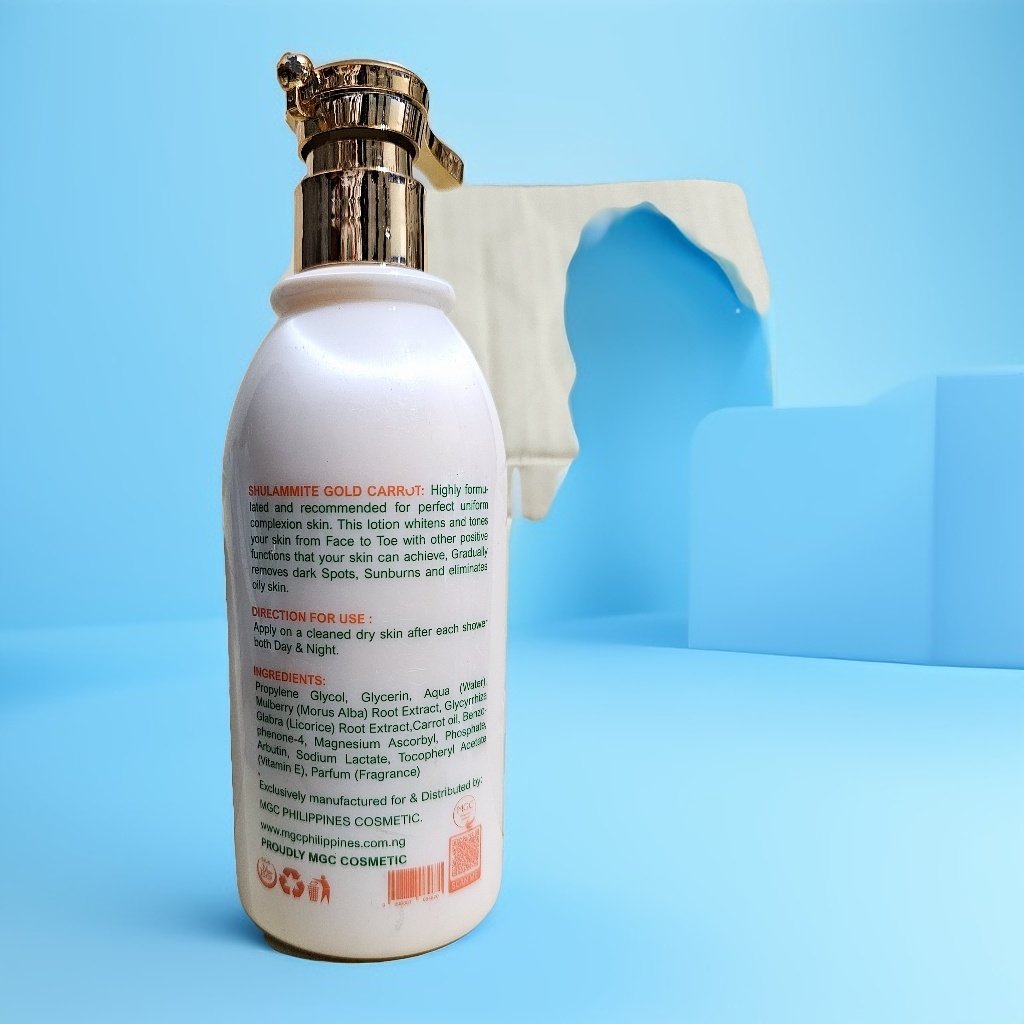 Shulammite Gold Carrot: highly formulated and recommended for perfect uniform complexion skin. This lotion whitens and tones your skin from face to toe with other positive functions that your skin can achieve.