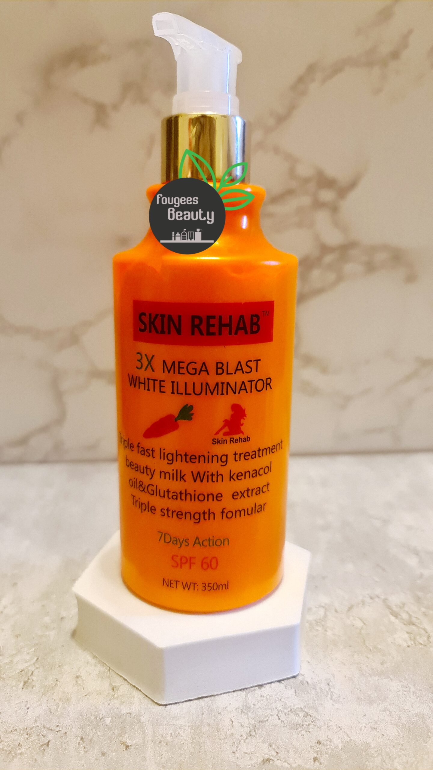 SKIN Rehab 3X Mega blast white illuminator Body milk is formulated with kenacol extracts and glutathione extract. It repairs damaged skin from use of hash bleaching chemicals (green veins/spider veins) with consistent use.