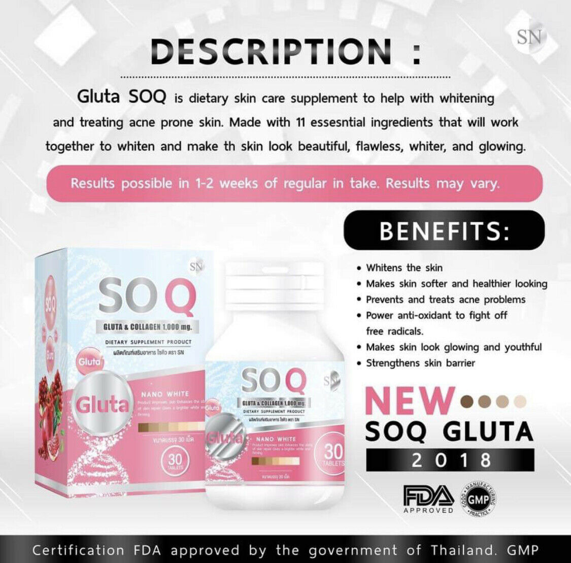 Gluta SoQ Collagen 10000 mg Whitening skin Reduces dark spots freckles A. Gluta SOQ red pomegranate (new formula) concentrate red pomegranate extract: give fast effect, 5 times whiter skin, pinkish bright skin, more-resistant to sunlight.