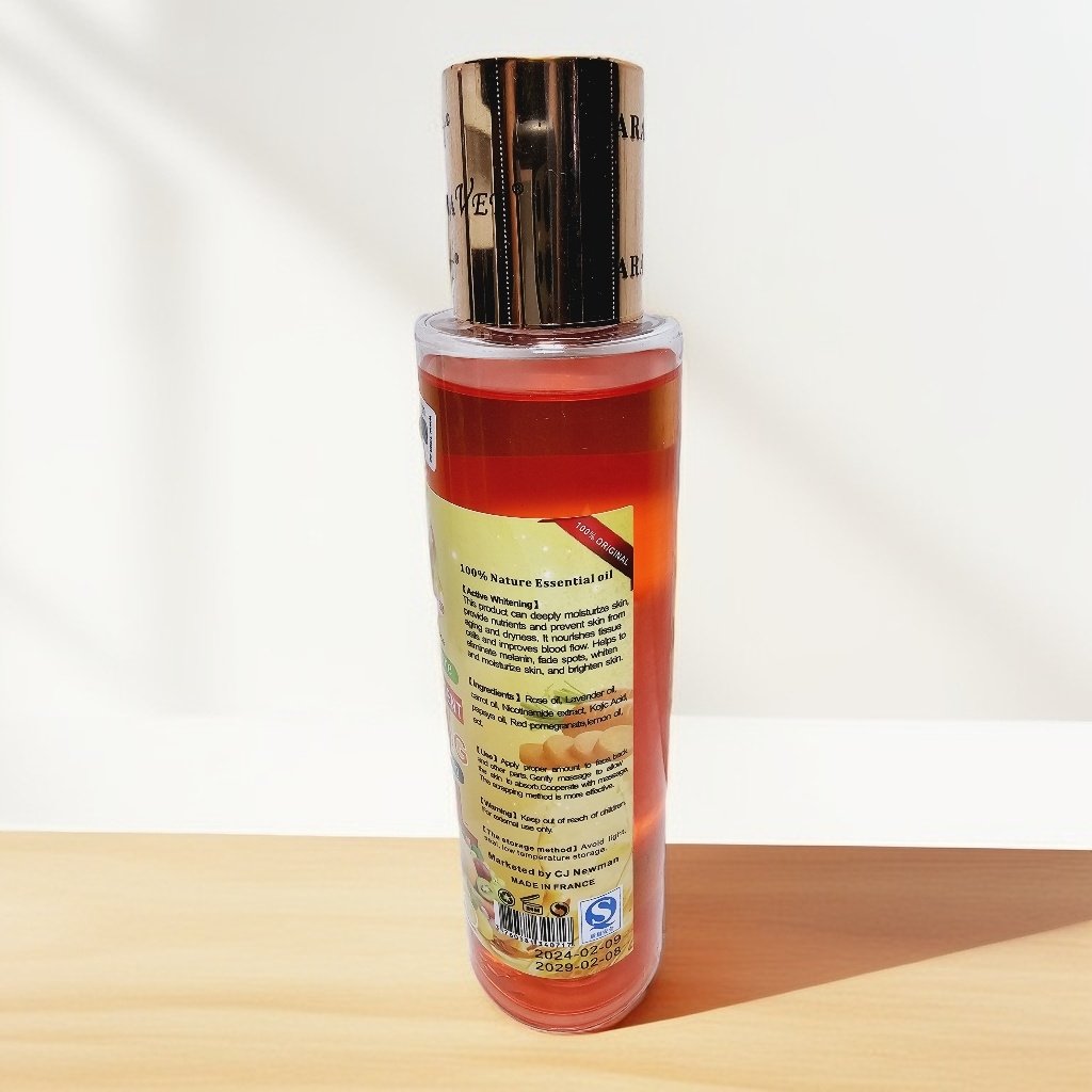 7 Days Active Whitening oil. Contains rose oil, lavender oil, carrot oil, Niacinamide extract, Kojic acid, papaya oil and many more.