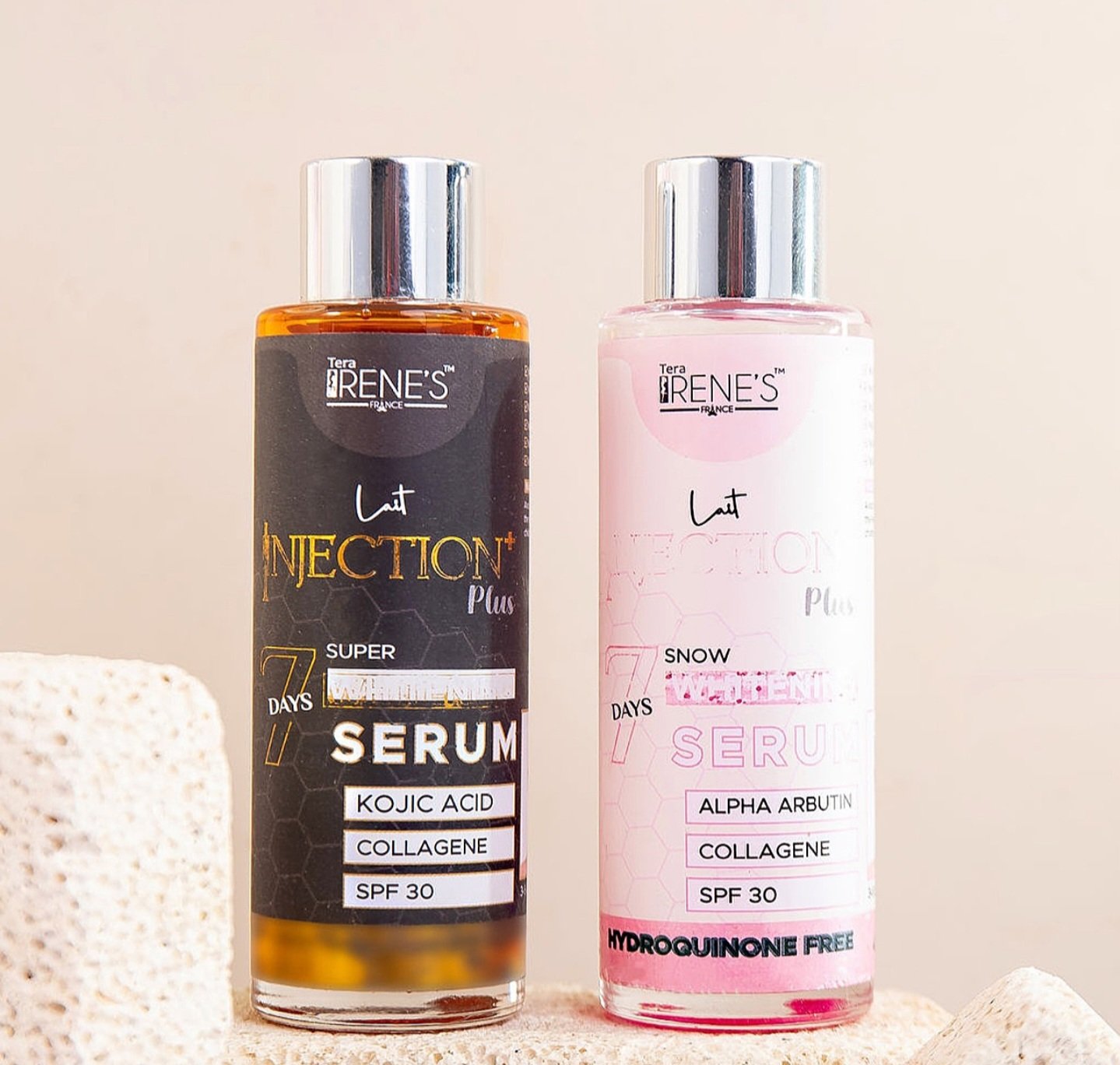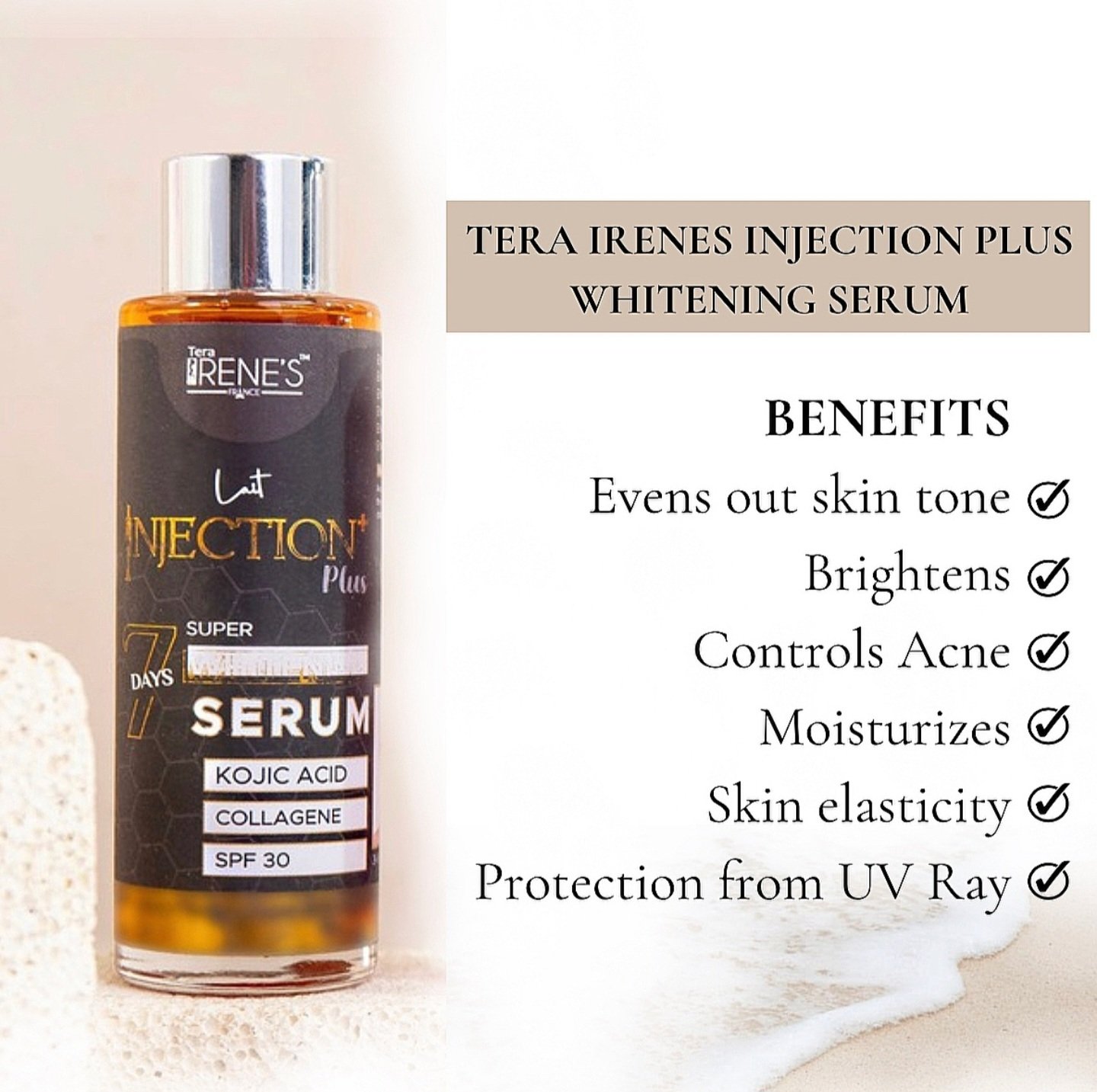 Tera Irene’s last injection plus serum is highly concentrated and made with the best skin whitening and glowing ingredients such as kojic acid, collagen and mineral oil. Can be mixed with the lotion for faster effect.