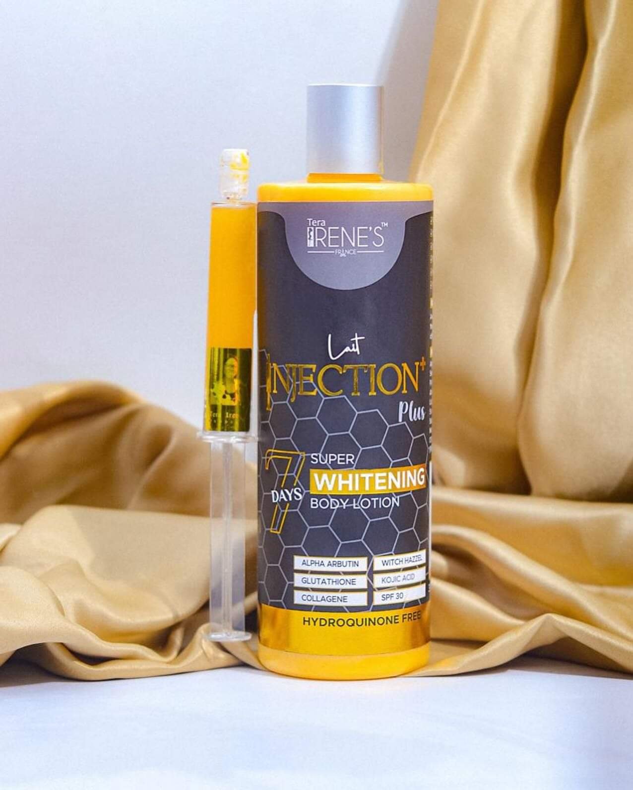Tere Irene’s injection lotion is beautiful luxurious non greasy lotion that provide specific treatment for the body. It work deeply into the skin and on its surface to brighten dark spots due to hyperpigmentation and use of the unsafe cosmetics products. Day after day perfect ingredients improve skin is colour by diminishing content of dark pigment and clarifying dark spots. Powerful activities work in synergy to give you the look your looking for :clear uniform and smoothTere Irene’s injection lotion is beautiful luxurious non greasy lotion that provide specific treatment for the body. It work deeply into the skin and on its surface to brighten dark spots due to hyperpigmentation and use of the unsafe cosmetics products. Day after day perfect ingredients improve skin is colour by diminishing content of dark pigment and clarifying dark spots. Powerful activities work in synergy to give you the look your looking for :clear uniform and smooth