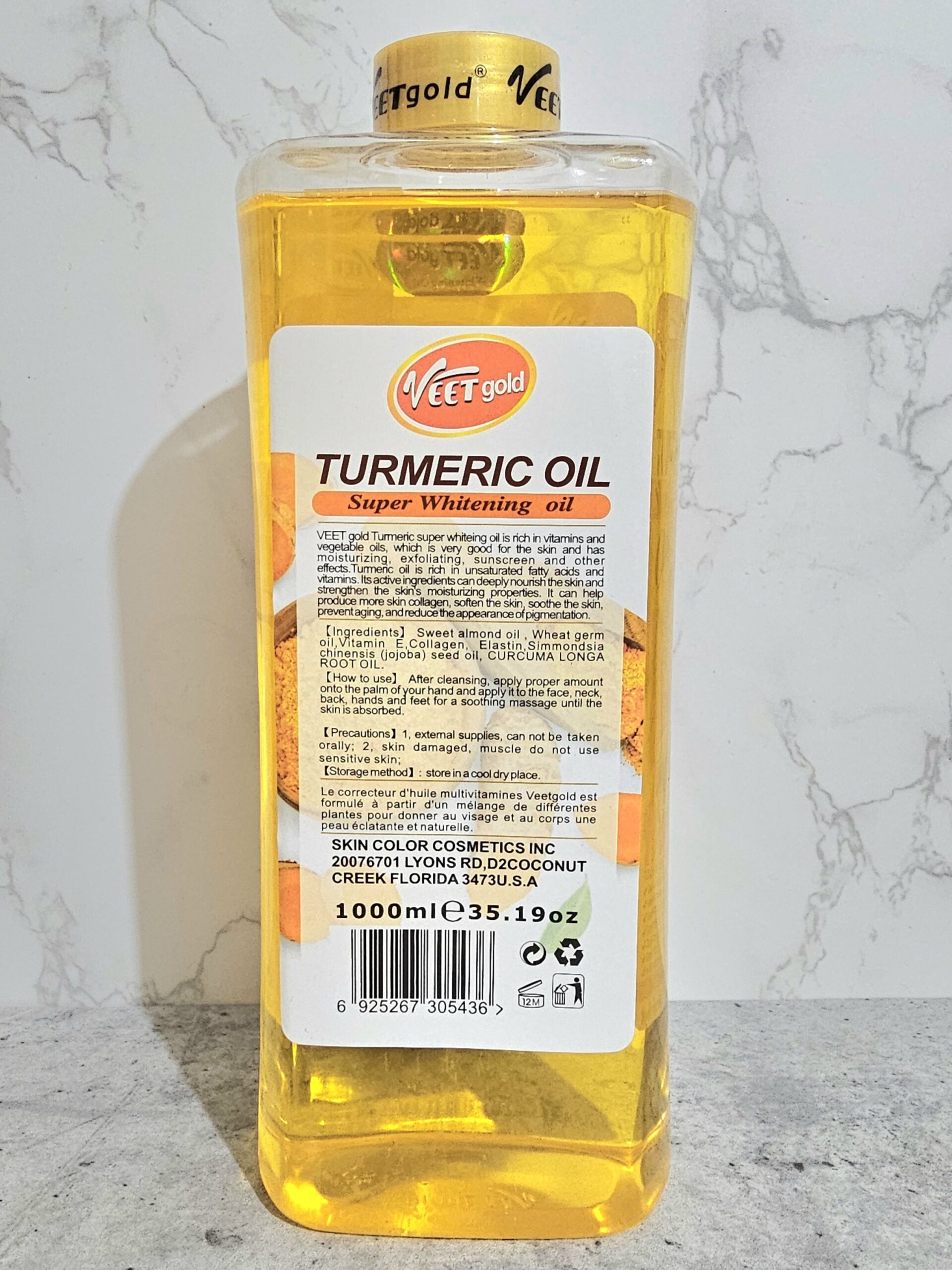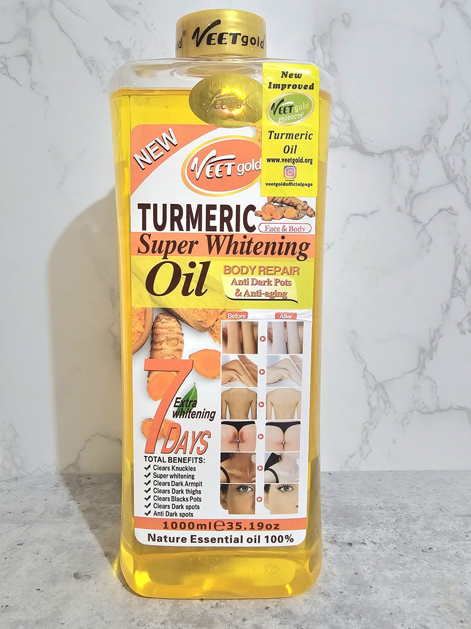 Veet gold Turmeric super whitening oil is rich in Vitamins and vegetable oils, which is very good for the skin and has moisturising, exfoliating, sunscreen and other effects. Turmeric oil is rich in unsaturated fatty acids and vitamins. It’s active ingredients can deeply nourish the skin and strengthen the skin’s moisturising properties. It can help produce more skin collagen, soften the skin, soothes the skin, prevent aging and reduce the appearance of pigmentation.