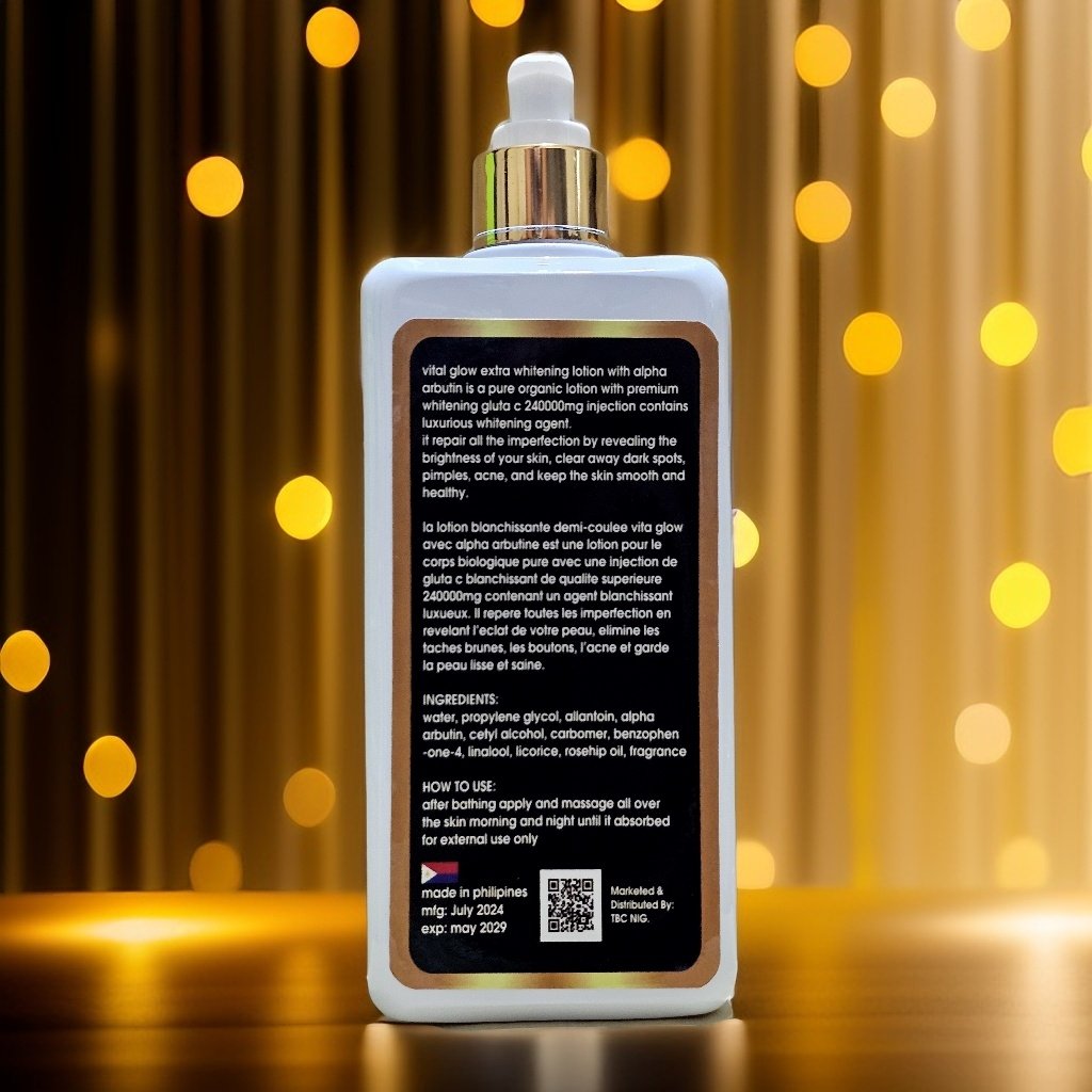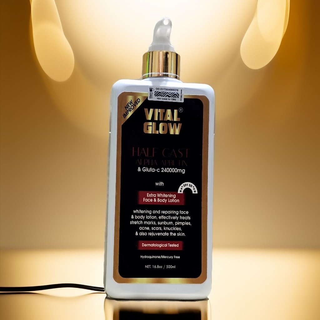 Vital Glow half cast whitening lotion with alpha arbutin is a pure organic body lotion with premium whitening gluta-c 240000mg injection contains luxurious whitening agent. It repairs all the imperfection by revealing the brightness of your skin, clear away dark spots, pimples, acne and keep the skin smooth and healthy.