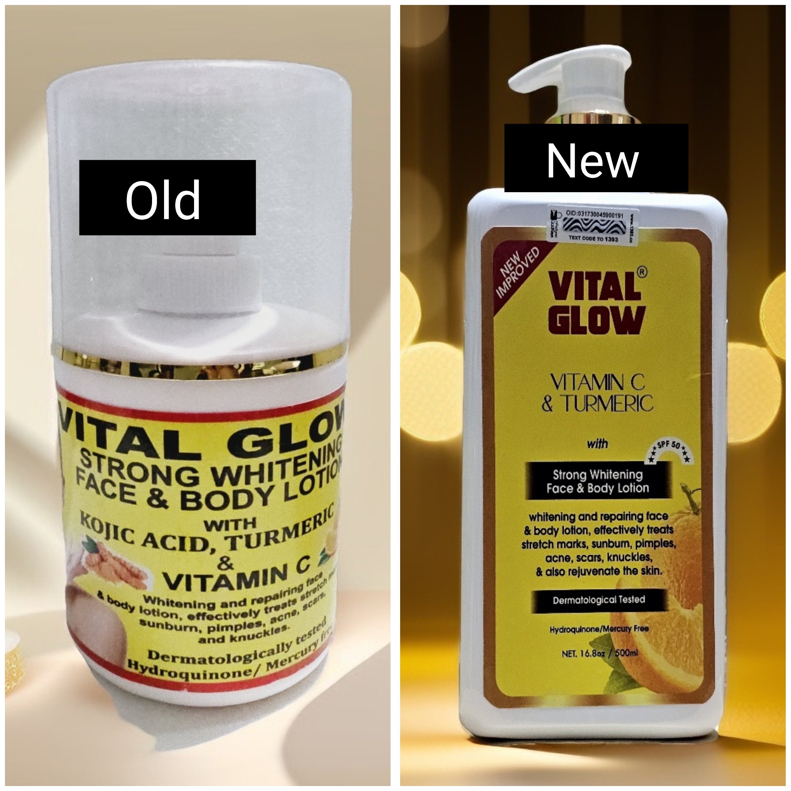Vital Glow strong whitening face and body lotion with Kojic Acid, Turmeric and Vitamin C. Whitening and repairing face and body lotion, effectively treats stretch marks, sunburn, pimples, acne, scars and knuckles.